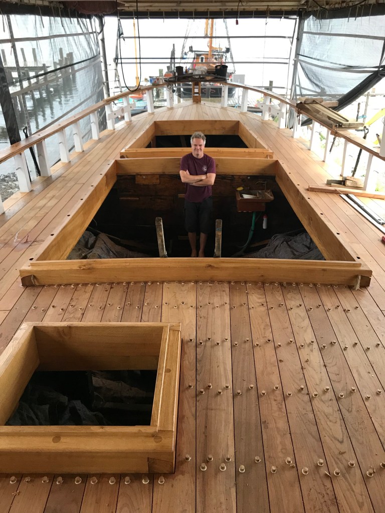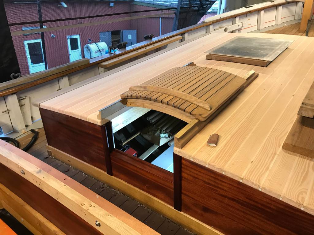 Mit dieser Art Pilz ist aber nicht zu spaßen, der vernichtet ein Holzschiff im Handumdrehen. Also abreißen und den Ursprung finden. Der letzte Fitzel von dem Mist muss raus. Vom Aufbau ging es ins Deck, die mit Baumwolle Kalfaterten Nähte entlang in den nächsten Aufbau…. Und so weiter und so fort.