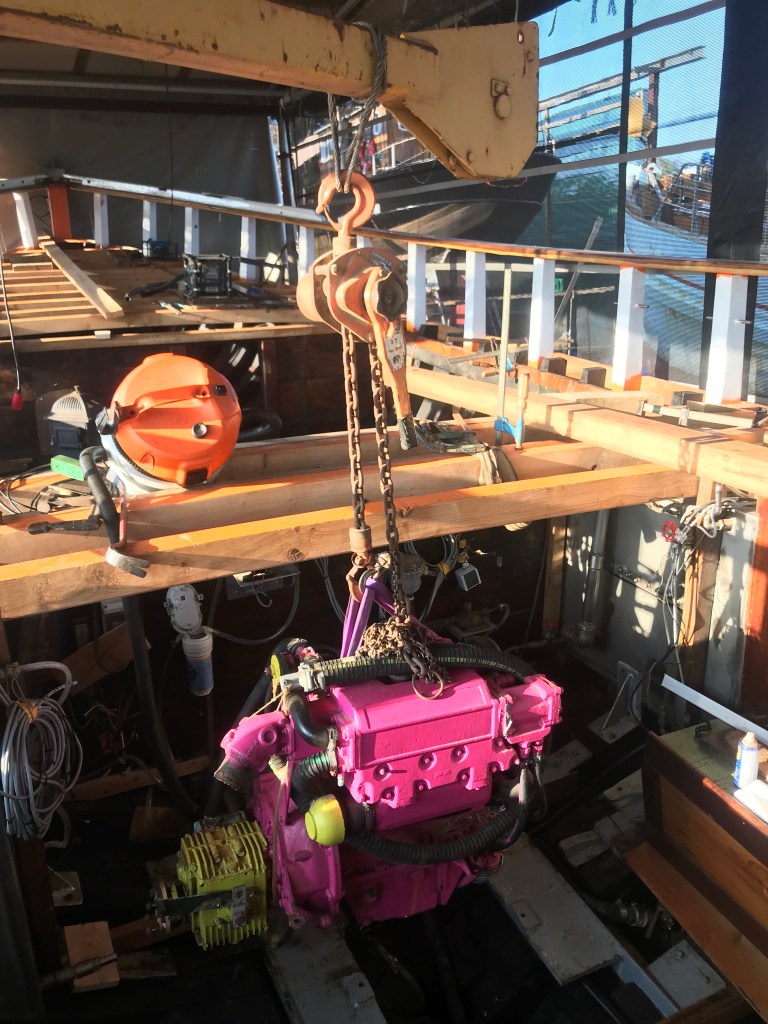 Jetzt ging es los. Die Werft baut den Rumpf neu, natürlich nochmal stärker. Ein etwas unzuverlässiger Motormann die neue Maschine, natürlich stärker und durch Kielkühlung eisgeeignet. Wir machen uns an den neuen Innenausbau und die Konservierung (sollte ungefähr so werden wir vorher, ist jetzt komplett anders.) Wir haben jetzt sogar ein Klo.