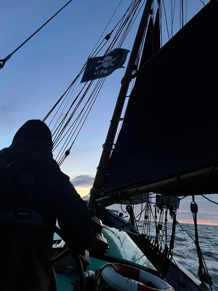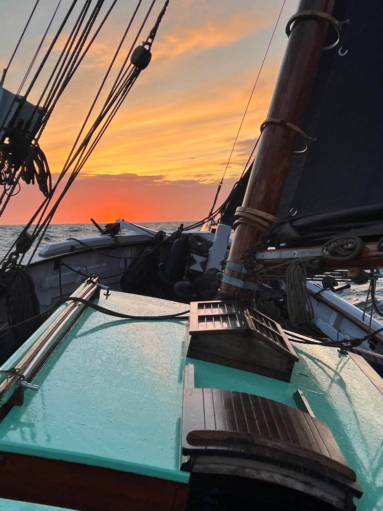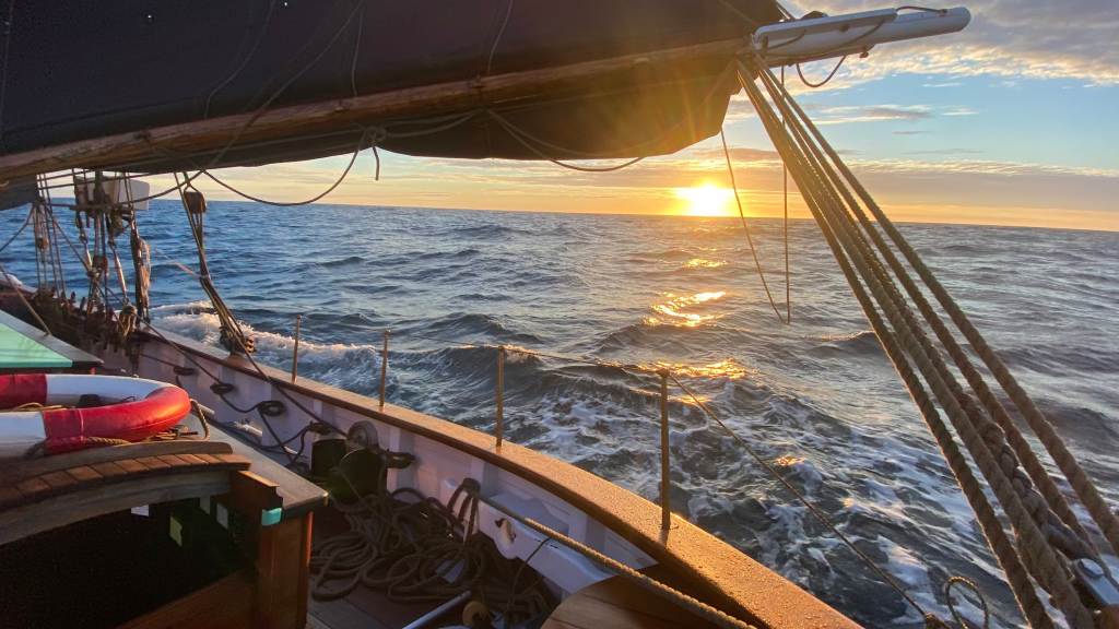 Nachdem alles seinen energieärmsten Zustand auf dem Leeboden der Kajüten erreicht hat, verliert der Wind, mit aufgehender Sonne seine Spitzen und wir schütteln die Reffs aus dem Groß.