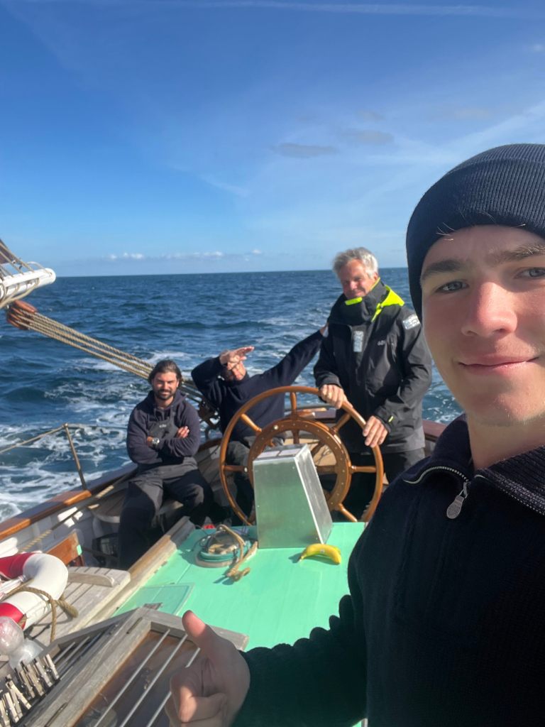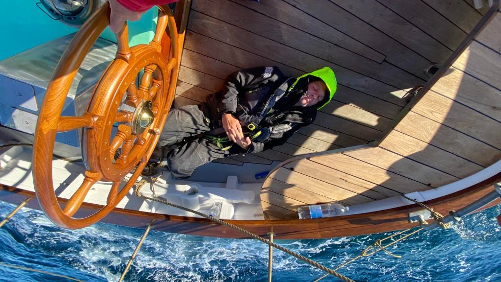 Mit 2-fach gerefftem Großsegel, Fock und Klüver laufen wir immer noch 5-7Knoten, 60 Grad am Wind. Allerdings werden wir sehr nass. Viel grünes Wasser an Deck, die Freiwache muss mit geschlossenen Luken klarkommen. Wenn uns eine brechende See trifft, stehen wir bis zu den Waden im Wasser aber Aurora fährt stabil weiter ohne sich zu schütteln oder ernsthaft langsamer zu werden. Toll. Unter diesen Bedingungen haben wir Sie selten gesegelt, erst recht nicht nach dem Umbau des Kieles und der Steuerung. Alles funktioniert perfekt.