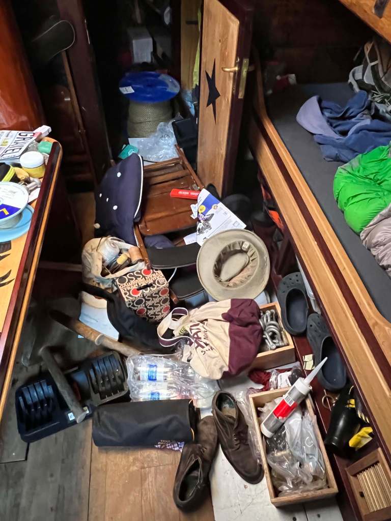 Nicht perfekt ist bis jetzt das Verstaumanagement. Zu viele Sachen sind nicht gut genug gesichert und fliegen durch die Messe. Christian sieht sich in seiner Koje einem Regen aus Tellern und großen Messern ausgesetzt.