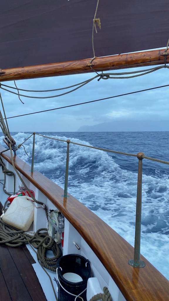 Am Ende der Wolke ist auch der Wind zu Ende. Der Seegang rollt uns durch, die Segel stützen nicht mehr sondern schlagen wie bescheuert nervig ins Leere.