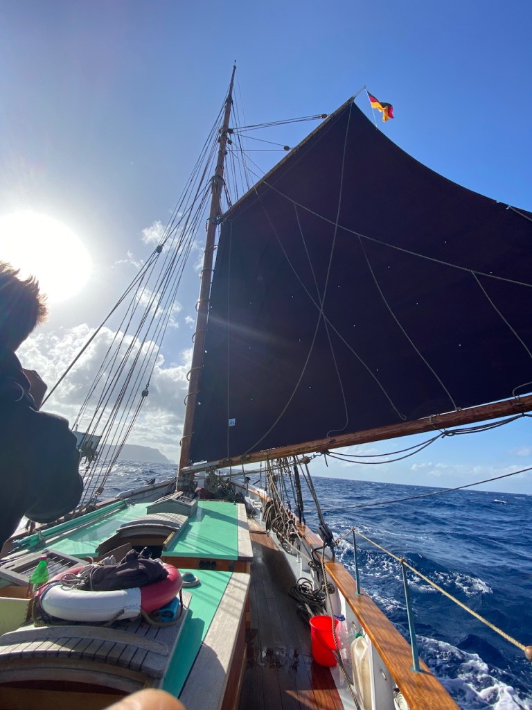 Noch 30 Meilen. Der Wind dreht nochmal ordentlich auf und als wir auf die Ostspitze von Madeira zu preschen, steigt vor uns eine schwarze Wand aus dem Wasser und fällt mit einer explosionsartigen Gischtwolke zur Seite. Eine Gruppe springender Buckelwale. Da bleiben Münder offen.