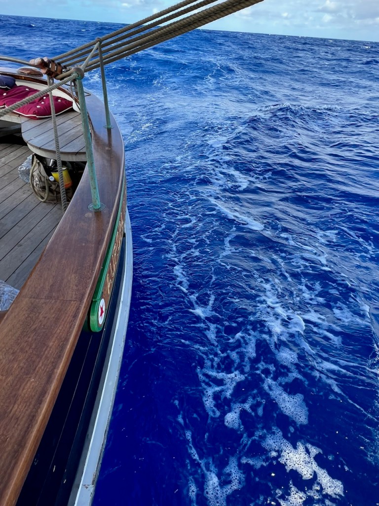 Morgens, die Nacht war ruhig und die Wache nicht so laut, strahlendes Sonnenlicht an Deck. Was hat das Meer für eine unbeschreibliche Farbe….