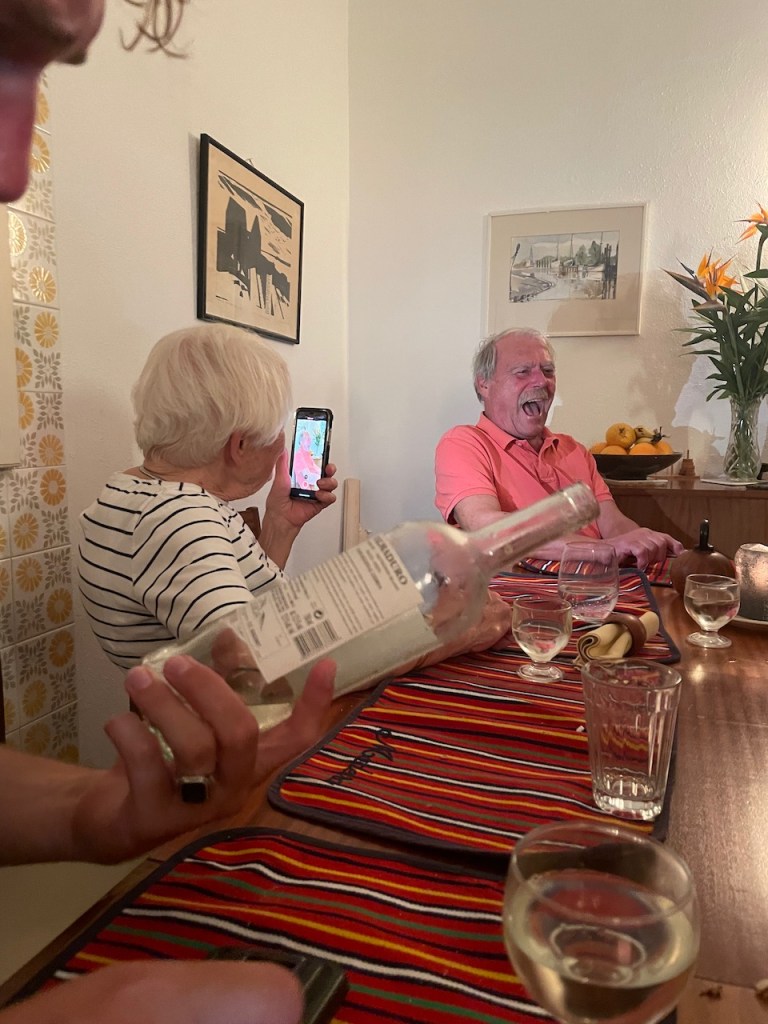 Selbstgestaltete Weinprobe, jede und jeder stellt einen Wein vor. Sehr amüsant und bestimmt komplett korrekt.