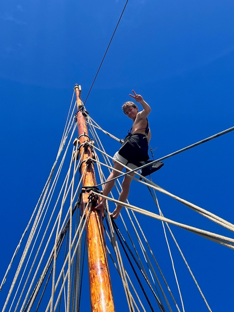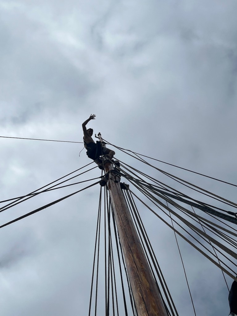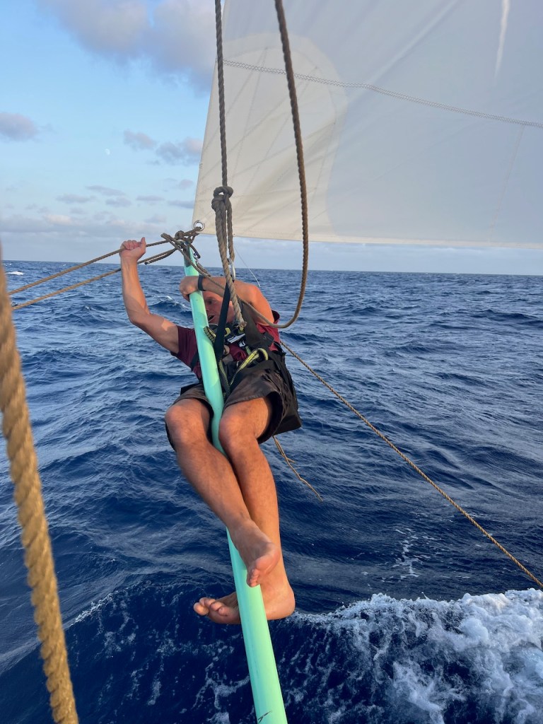 Mutter bringt noch 2 neue Passatsegel mit, vielen Dank nochmal an Faber & Münker für die Schnelle Produktion. Hierfür konstruieren wir 2 neuen Fallen, das sind die Seile, die die Segel hochhalten, bis man sie loswirft. Dann Fallen die Segel.
