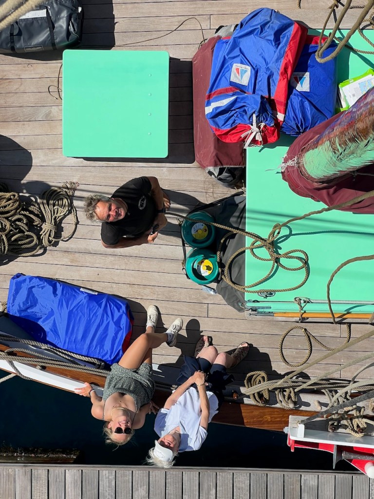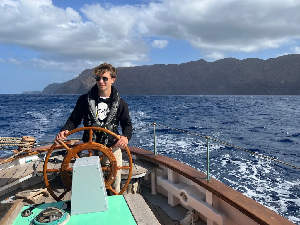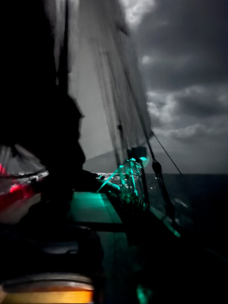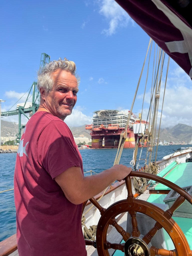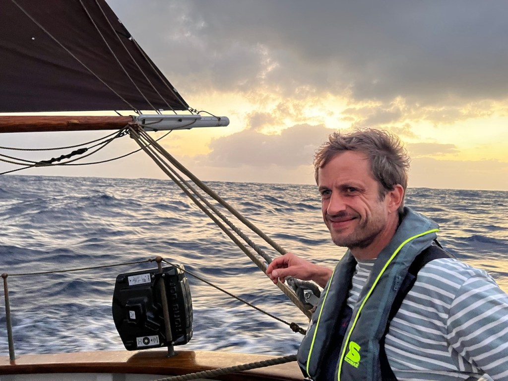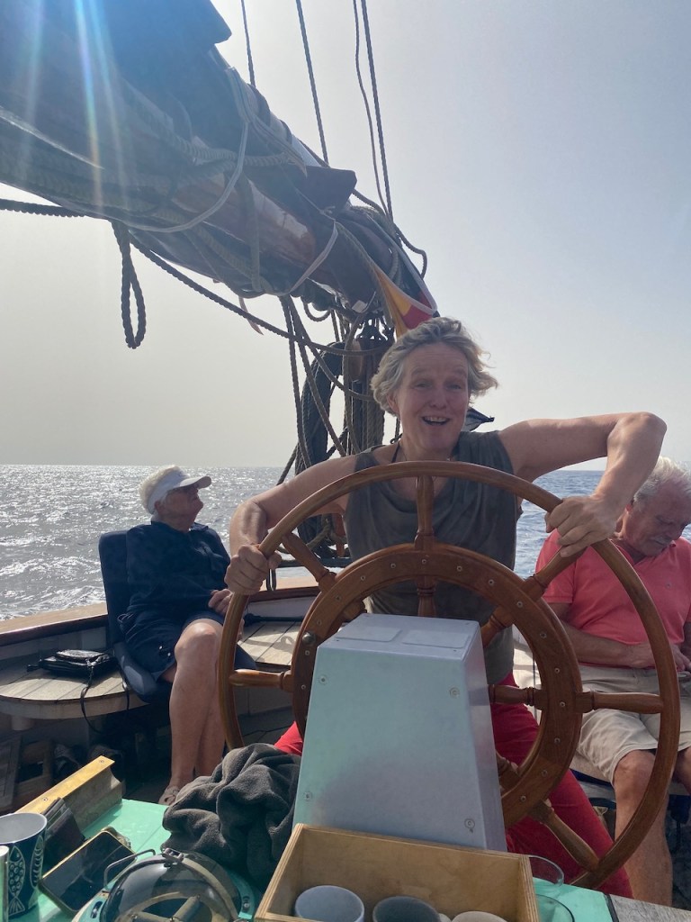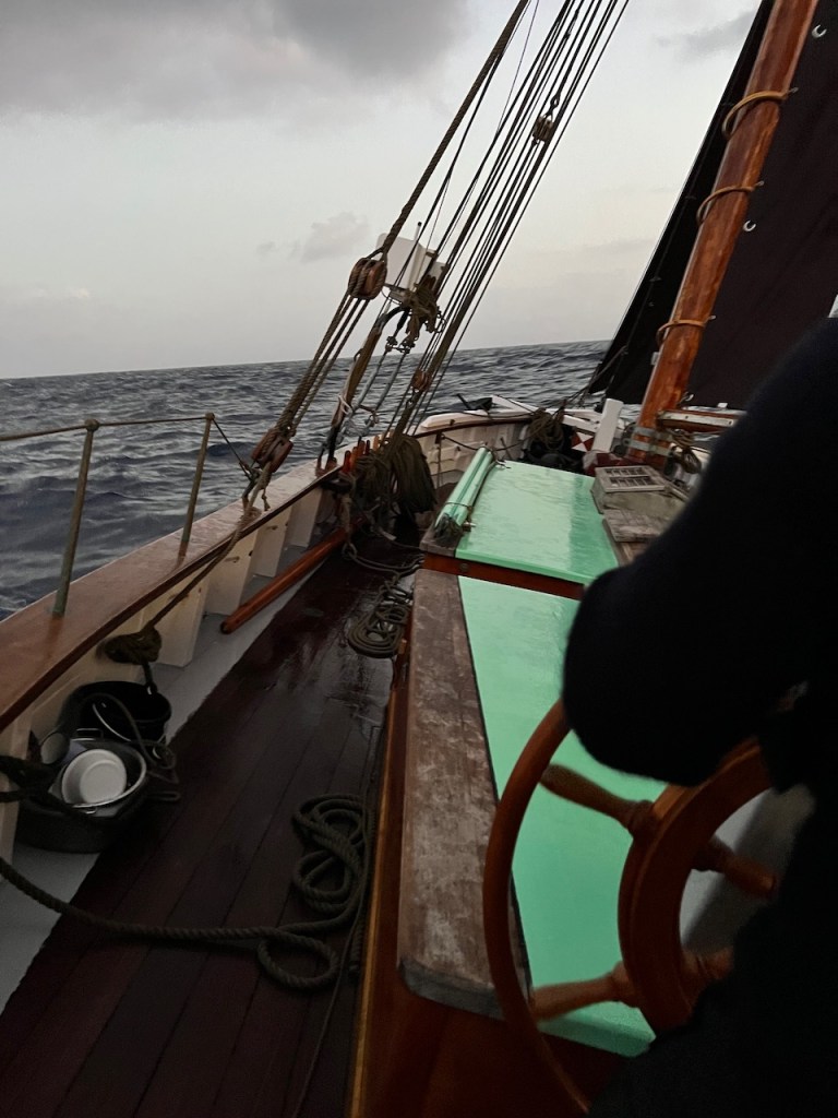 Doch vom ersten Moment an ist da viel mehr gewesen als ein hübsch zurechtgemachtes, historisches Segelboot. Ich erlebe Aurora als ein lebendiges Geschöpf, welches all die Hingabe, die ihr zu Teil geworden ist, in sich aufgenommen hat. In der Mond beschienen Nacht auf dem offenen Atlantik stehe ich am Steuer, spüre Aurora in meinen Händen und unter meinen Füßen wie einen Organismus. Jesper hält Wache mit mir, muss dann aber mal für ein paar Minuten unter Deck verschwinden. Und dann bin ich da. Ganz allein. In dieser weite. Auf Auroras Rücken. 360 Grad Wasser. Ich selbst unendlich klein und grenzenlos frei zugleich. In der Dünung der Atlantik- Wellen wogt und kränkte Rumpf. In mir vorher nicht bekannter Weise spüre ich Spannung in meinem ganzen Körper, bewege mich gemeinsam mit Aurora in alle Richtungen, wie verschmolzen mit einem Fabelwesen. So hätte ich mir als Kind den Ritt auf dem Glücksdrachen Fuchur vorstellen können. Ein Erlebnis, welches ich niemals vergessen werde.“