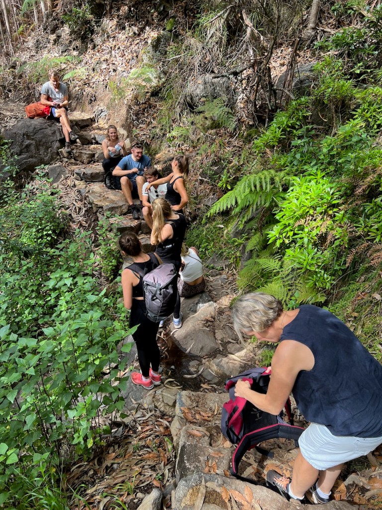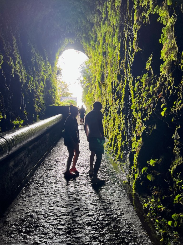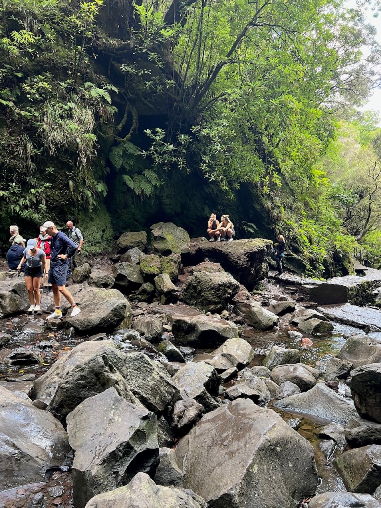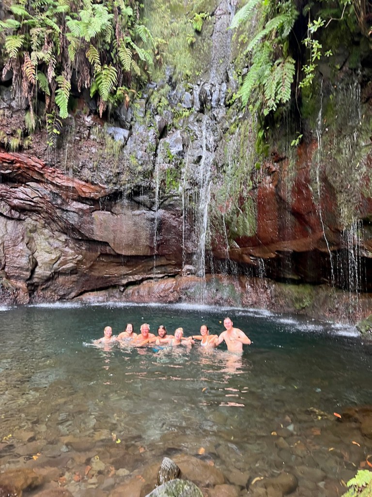 Wanderung zu den 25 Fontes mit 800 Meter langem dunklen, tropfenden Tunnel und Bad unterm Wasserfall, zusammen mit unglaublich vielen anderen Touries.