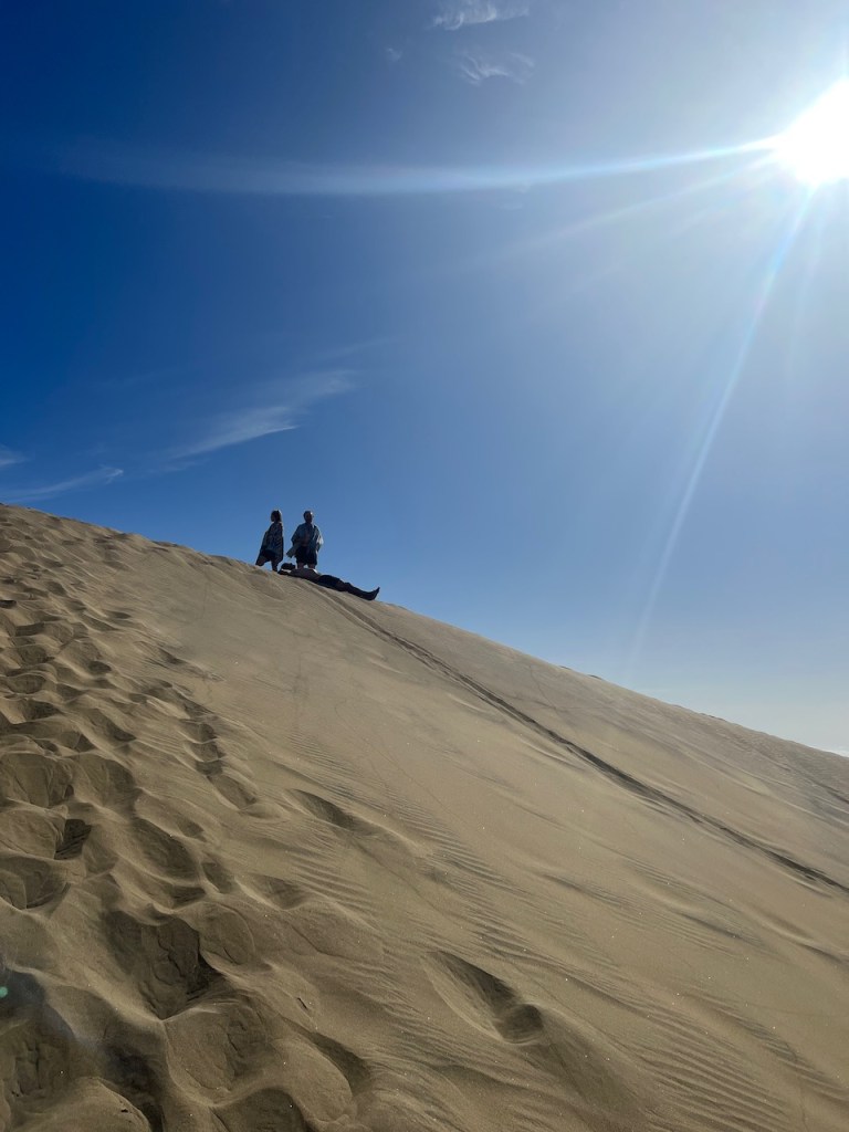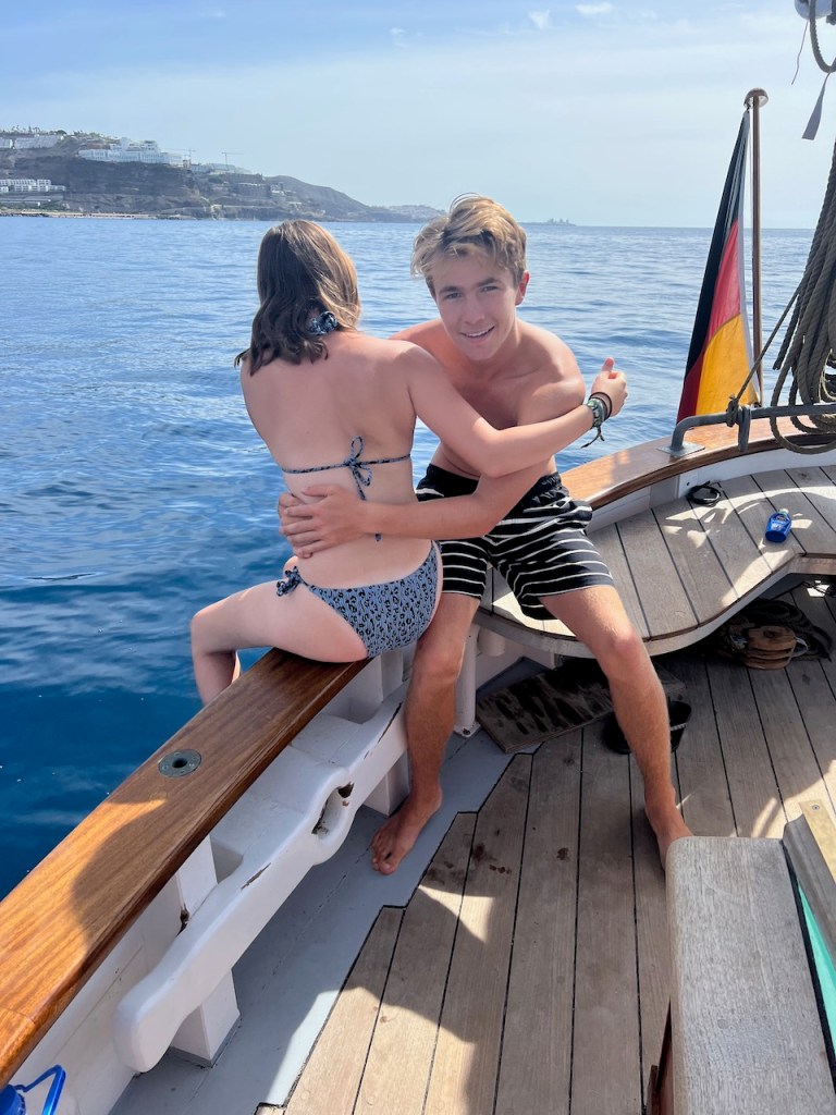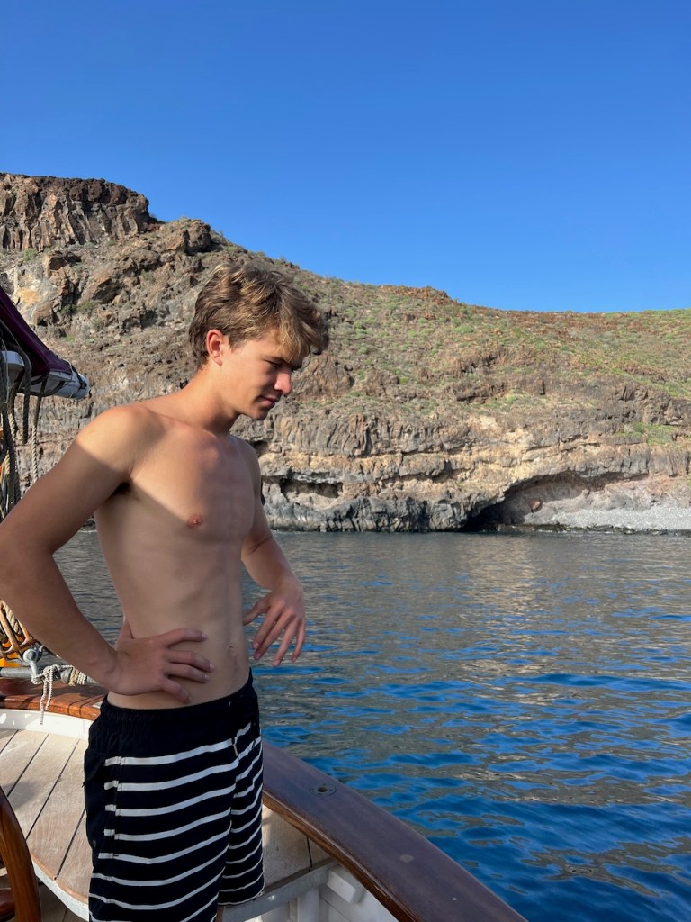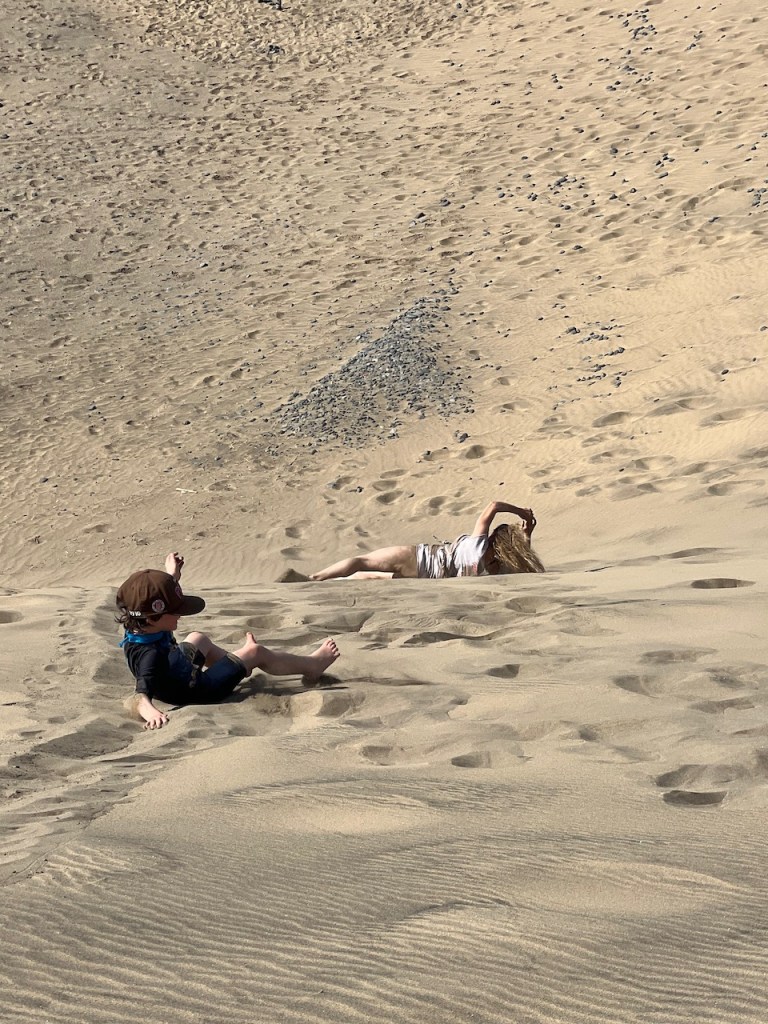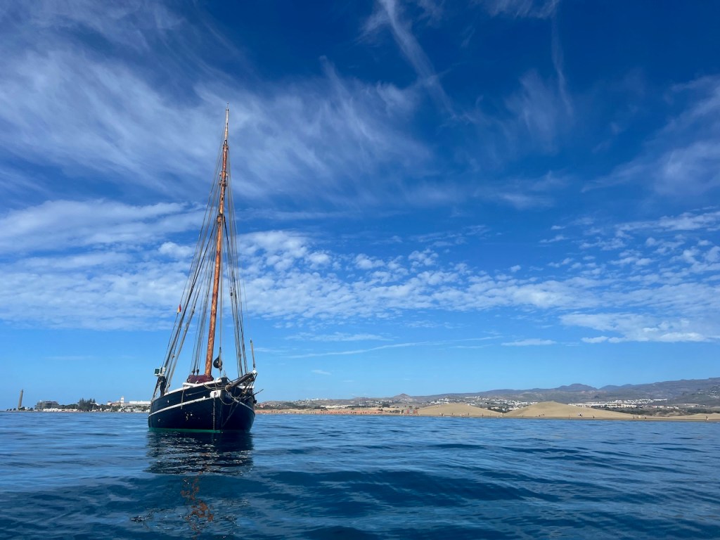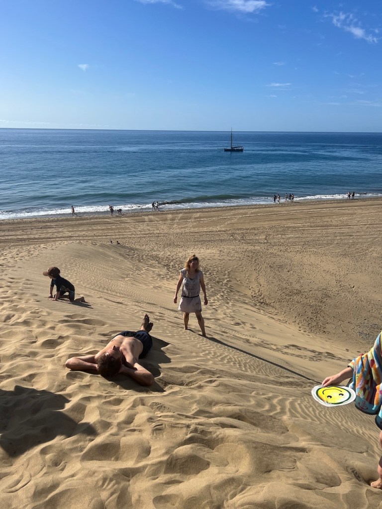 Früh werden die abreisende Ida und der sie zum Flughafen bringende Tom an Land gefahren und der Anker gelichtet. Wir wollen vor der großen Düne bei Maspalomas baden und frühstücken. Das ist wirklich beeindruckend, echtes Wüstenfeeling. Wegen kompletter Windstille fahren oder schwimmen wir alle zusammen an Land. Aurora und die Düne sind ein grandioses Fotomotiv. Das Besteigen und wieder hinabrollen der Sandberge hält uns allerdings nicht lange an Land. Viel zu heiß. Und viel zu viele nackte, rote Strandläufer.