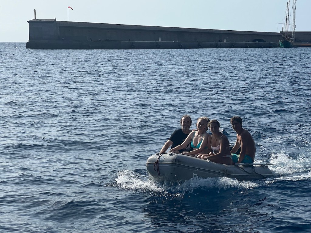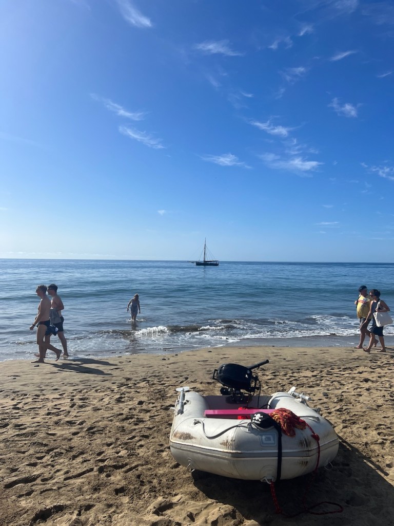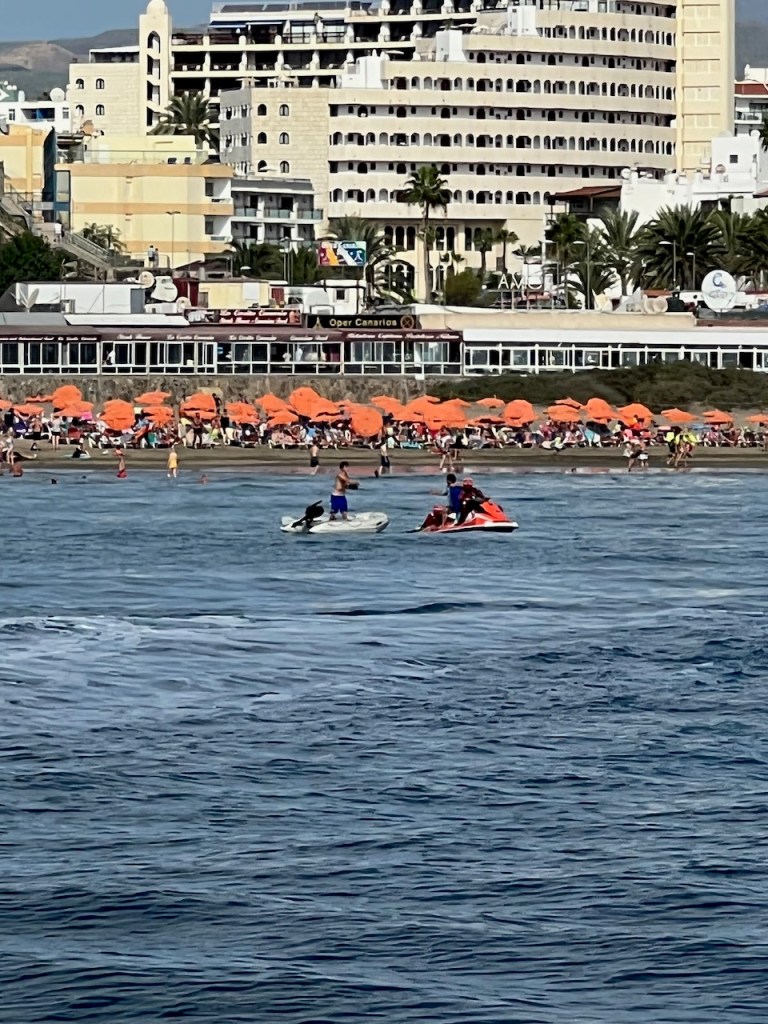 Unser Ziel Posito Blanco ist wieder eine Ferienanlage mit Privat Marina und recht geschützter Ankerbucht. Und Busanbindung. Die brauchen wir morgens da Carola und Niko aussteigen müssen. 2 Stunden vor Jan/Bombe. Den fahren wir vor Maspalomas an Land. Wollen wir auf jeden Fall, aber der Schlauchbootmotor geht nicht an. Vorteilshaft kommen zwei Bay-Watch-Männer auf einem Jetski, übernehmen unseren Abreisenden samt Gepäck und fahren ihn an Land. Tom muss leider zurück rudern.