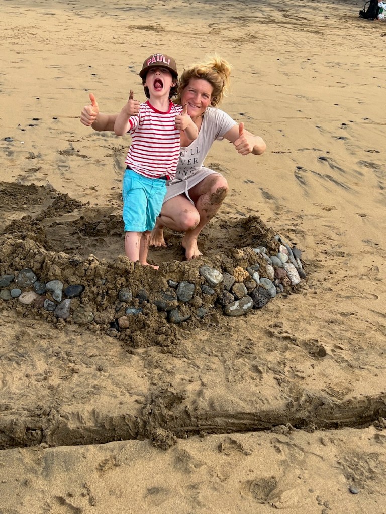 Von denen begleitet wandert Tom 3 Kilometer am Strand entlang zu uns. Wir retten ihn.