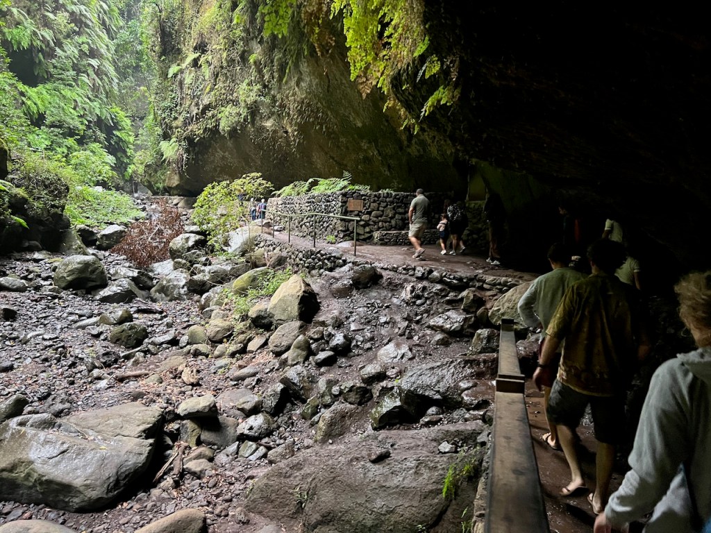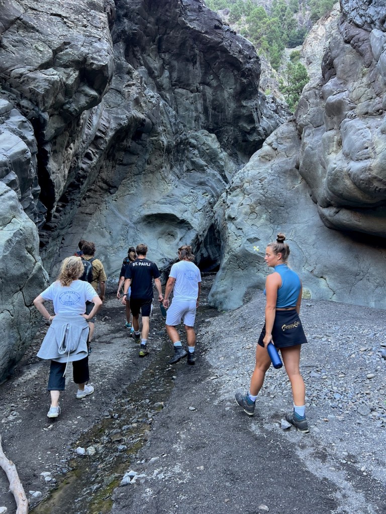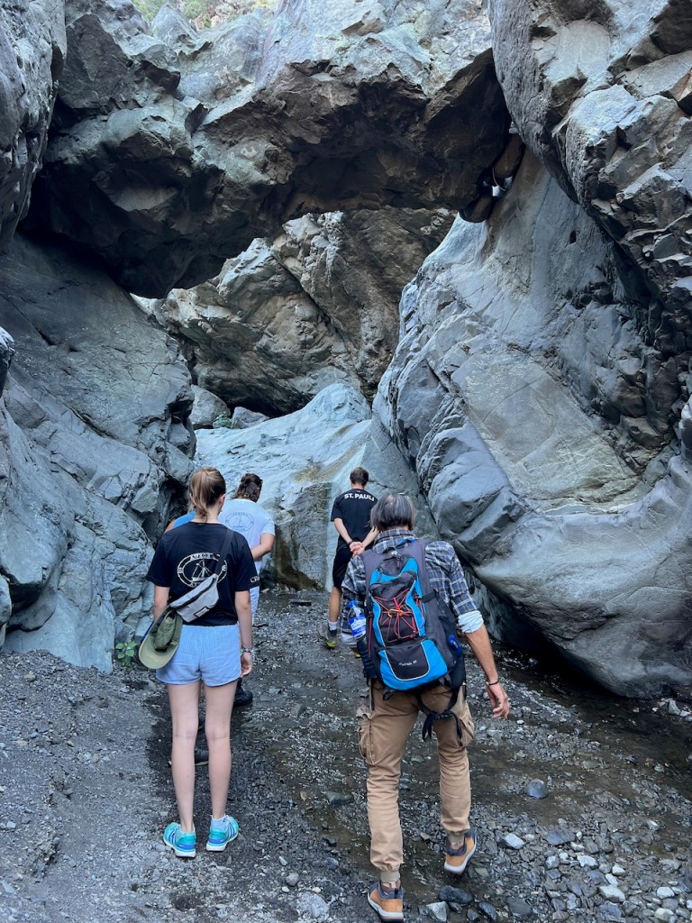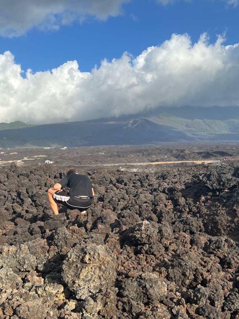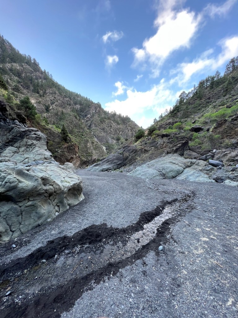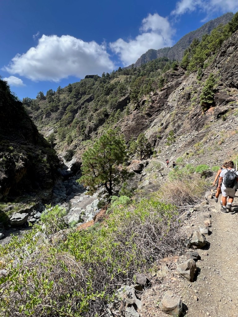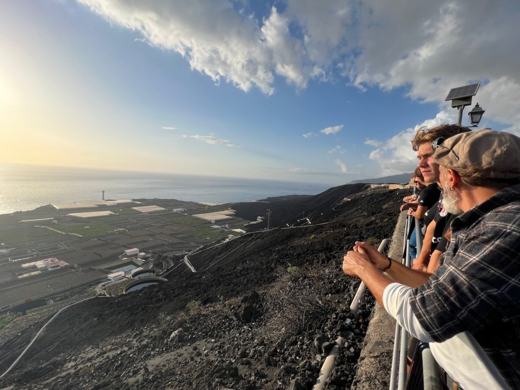 Frühstart. Wir treffen Adoni um 7:30 Uhr in einem Café. Fahren über/durch die Berge auf die andere, immer sonnige Seite. 5 Stunden dauert die Wanderung in den Calderao Verde, Kessel des größten Vulkans der Insel. Immerhin ist der erloschen. Nicht so der neue Kegel bei Los Lianos de Aridane, der im Frühjahr Leid und Verwüstung gebracht hat. Aus dem qualmt es noch, was uns Adoni genauso zeigt. Genauso wie Nicht-Touristen-Restaurants und eine herrliche Sonnenuntergangsbar.
