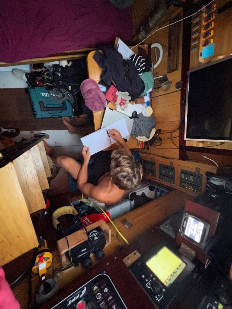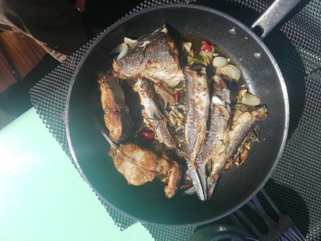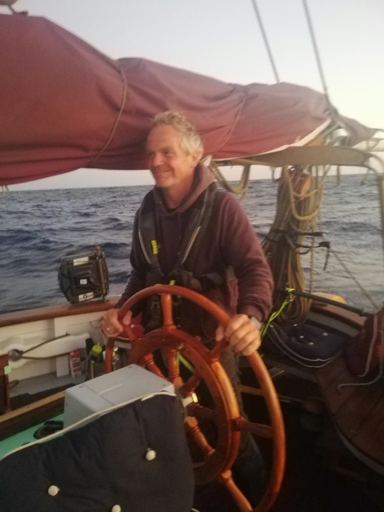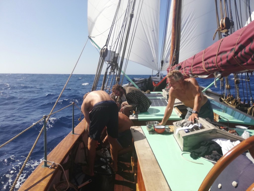 besonderen Vorkommnisse. Um 10 Uhr Frühstück (natürlich mit Fisch), anschließend Kraftsport auf dem Vorschiff und Körpergewichtsübungen auf dem Achterdeck, Kaffee und Kekse zum Nachmittag und ein mega leckeres Curry um 18 Uhr kurz vor der Dunkelheit. Zwischendurch viel Lesen und Austauschen über die neu erlernten Sterne und Sternbilder aus der letzten Nachtwache.
