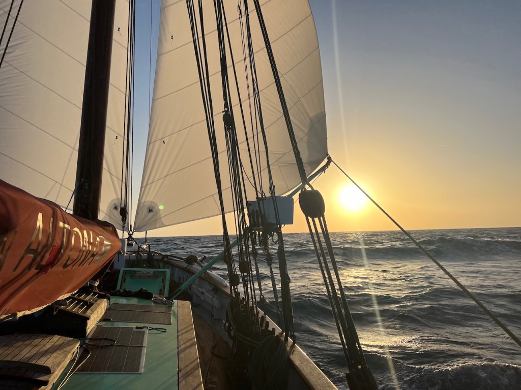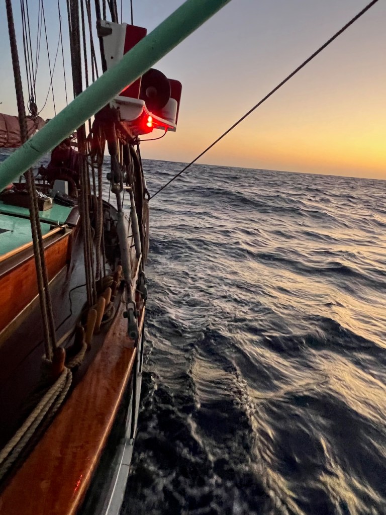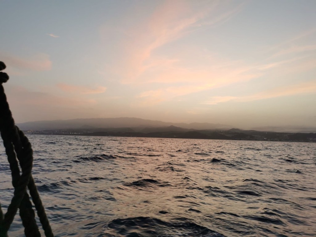 Der Wind sollte erst 2 Tage später wieder zunehmen, als an Deck der Aurora der Ruf „Land in Sicht“ schon längst vom Winde verweht wurde. Zwischen den Inseln Santo Antão und Santo Vicente verdoppelten sich die angezeigten Knoten unseres Windmessers und ermöglichten uns ein Einlaufen, wie es sich für eine solch schöne, spannende und entspannte Überfahrt gehört. Angekommen in der Bucht von Mindelo, präsentierte sich die Hafenstadt im Licht des bisher schönsten Sonnenunterganges und ließ die Vorfreude auf das Erkunden der Stadt und der Kapverdischen Inseln nochmal steigen. Erstmal mussten wir uns allerdings mit dem gucken aus der Distanz zufriedenstellen. Der Hafen kann uns erst morgen willkommen heißen. Kein Problem, die Crew genoß ihren wohl verdienten „Überfahrts-Rum“ am Anker und schwelgte über eine Schüssel Pasta Pesto in den Erlebnissen der letzten Tage und den Vorfreuden der kommenden.