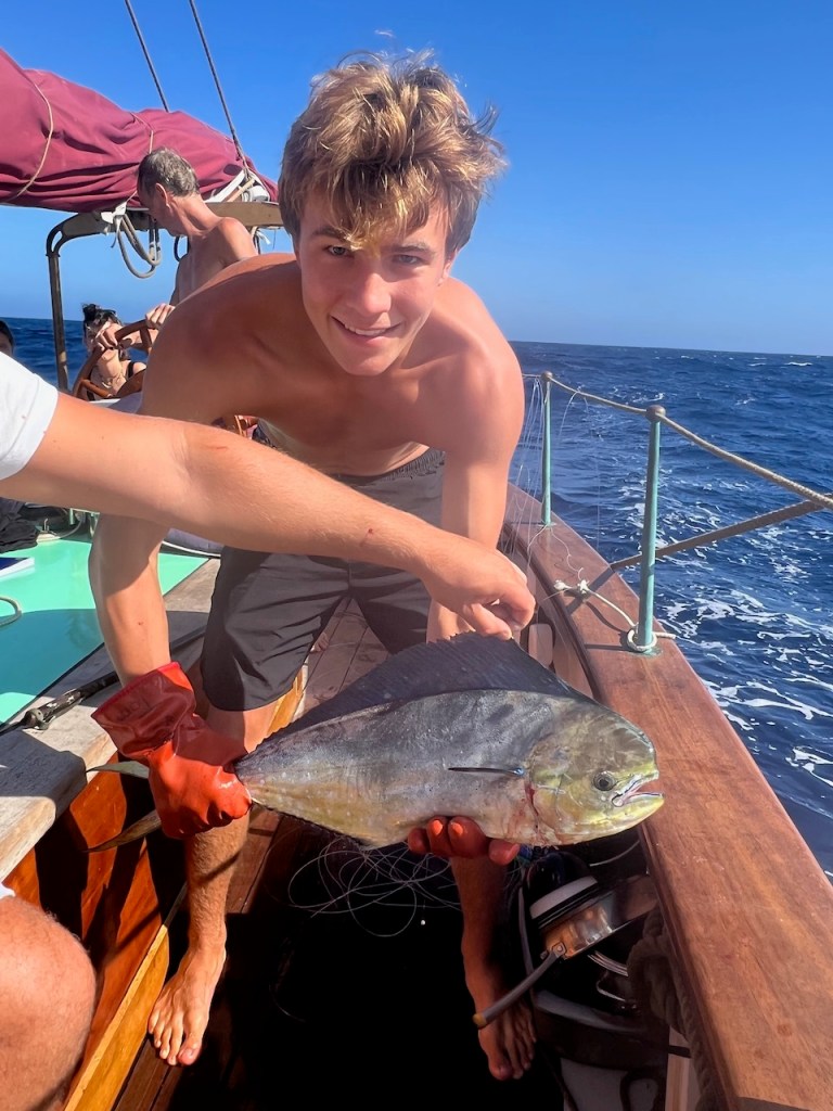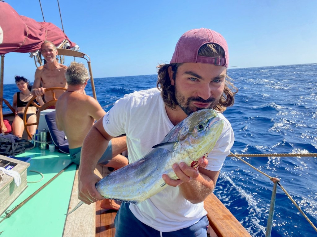 Als ich nach 9 Stunden schlaf, Luxus, um 8 Uhr zu meiner Wache erscheine, zeigt sich mir ein neues Bild. Die Aurora prescht bei 6 Windstärken mit 6-7 Knoten südwärts und treibt nicht nur eine große Bugwelle vor sich her. Überall um uns herum fliehen fliegende Fischschwärme vor uns und liefern ein Bild, was selbst die größten Ignoranten nicht kalt gelassen hätte. Die vier Kamikaze-Piloten, die es nachts nicht über die Aurora hinweg geschafft haben werden von Hauke ausgenommen und in Olivenöl, Knoblauch und frischen Kräutern für das bevorstehende Frühstück zubereitet. Das Leben ist herrlich! Und schon kurz nach dem Frühstück wird es noch besser. Der Bissanzeiger, ein an der Angelschnur befestigtes Gummiband, dehnt sich auf dreifache Länge und lässt vor allem Jespers Angelherz ein wenig schneller schlagen. Der gehakte Mahi Mahi wird an Bord gekämpft, bewundert und in Steaks verarbeitet, von welchen wir uns für die nächsten 2 Tage ernähren können. Ein wirklich sehr schönes Tier. Wie auch die fliegenden Fische. Beeindruckende Produkte der Natur und Evolution. Speziell Hauke ärgert es, sie immer erst nach verlorenem Kampf, tot an Deck aufzufinden, das muss doch anders gehen. Und da es bei uns ja bekanntlich gerade lief, wird auch dieser Wunsch in nicht allzu ferner Zukunft erfüllt werden. Nach dem Sonnenuntergang, welchen wir alle zusammen singend und Gitarre spielend auf dem Achterdeck verbrachten, ging die Zeit der Fische wieder los. Mit zunehmender Dunkelheit, verlieren sie ihre Orientierung (logisch, ist bei uns ja nicht anders) und es kommt zu Bruchlandungen an Bord. In dieser Nacht entscheiden sich jedoch fast alle Fische, Backbord vor dem Steuerrad zu landen, wodurch Hauke in seinen 4 Stunden Wache, 7 Fischen die Freiheit wieder geben kann. Die Freiheit wiedergegeben wurde sogar dem Kollegen, welcher sich als Landeplatz die Wange des Kapitäns ausgesucht hat. Allerdings mit kurzer Verzögerung wegen Schreck und so.