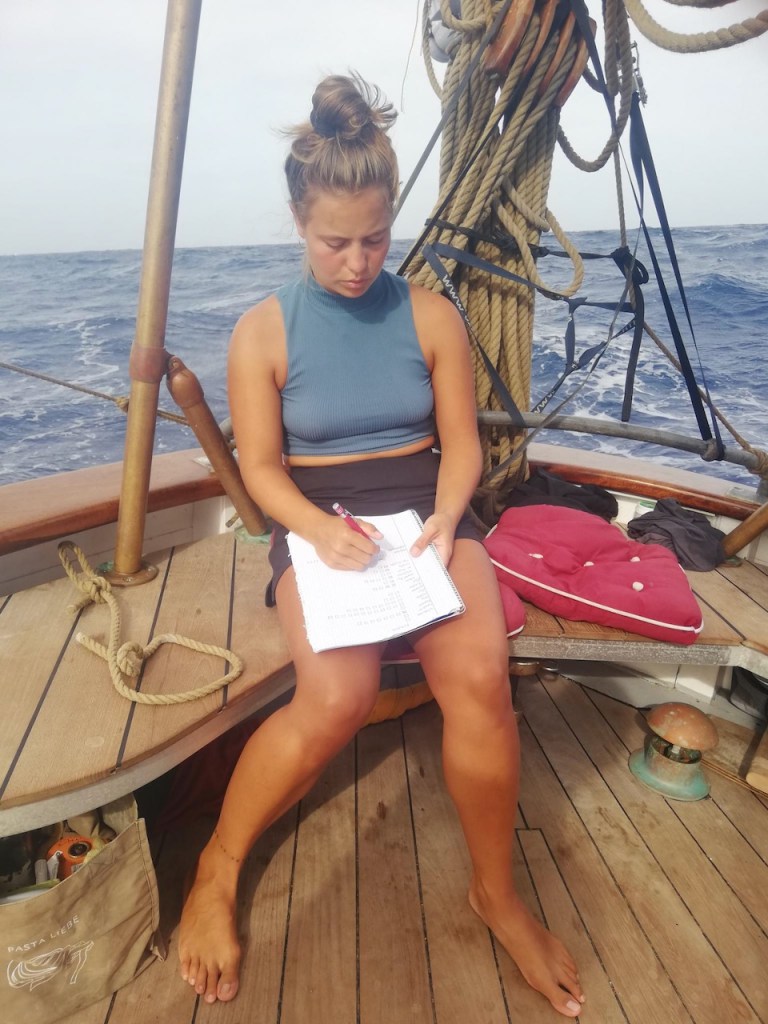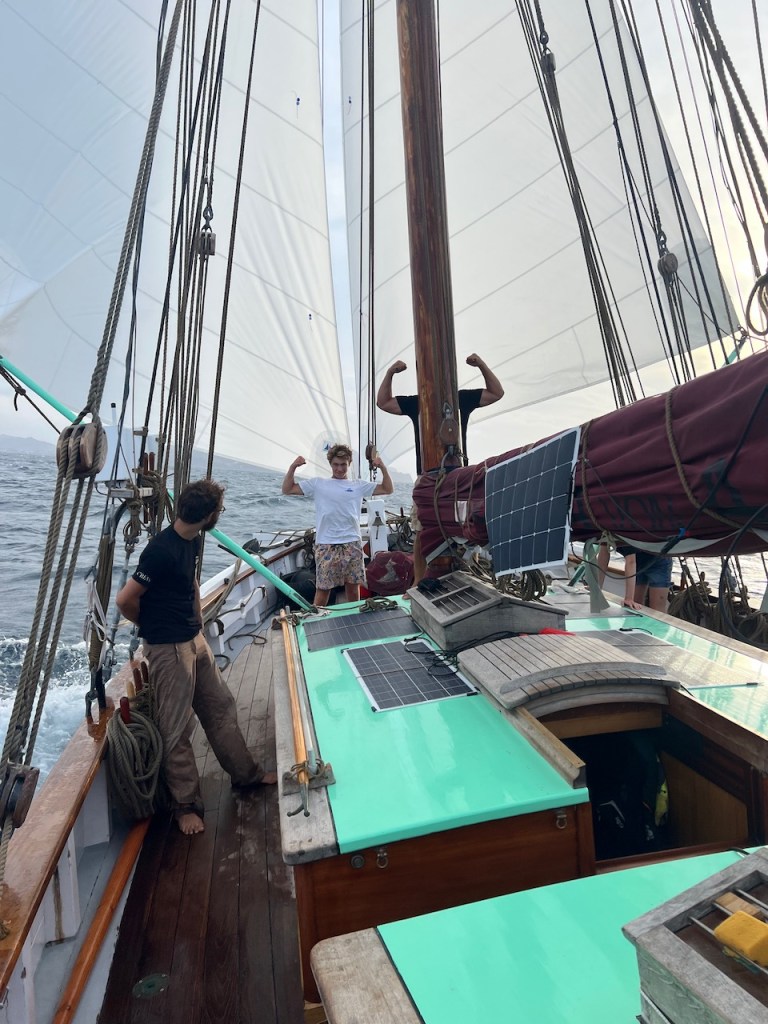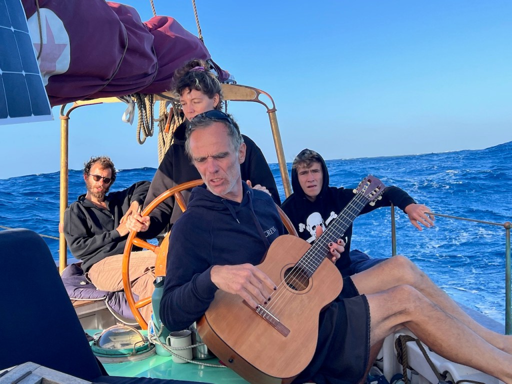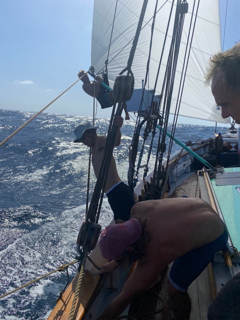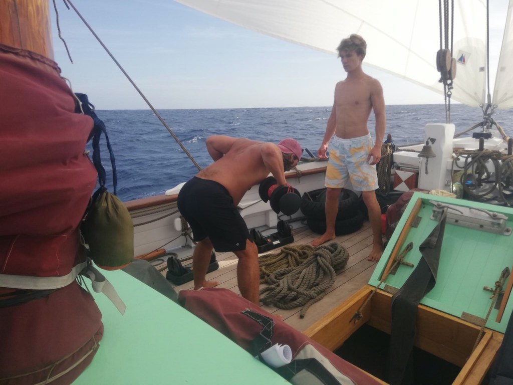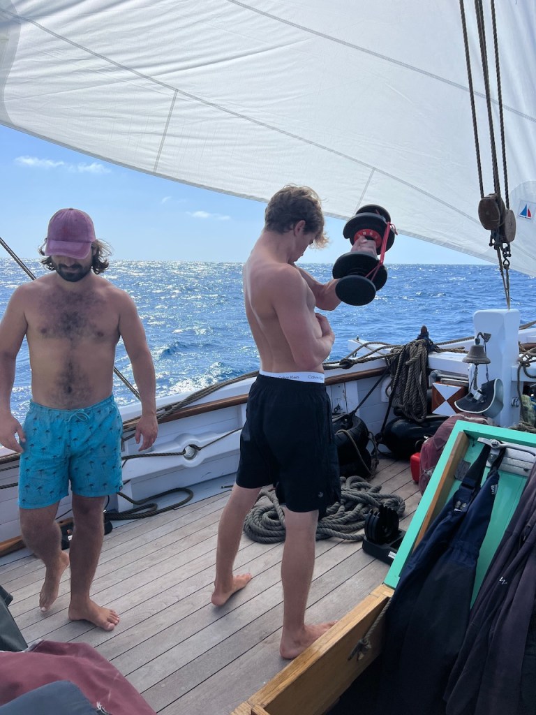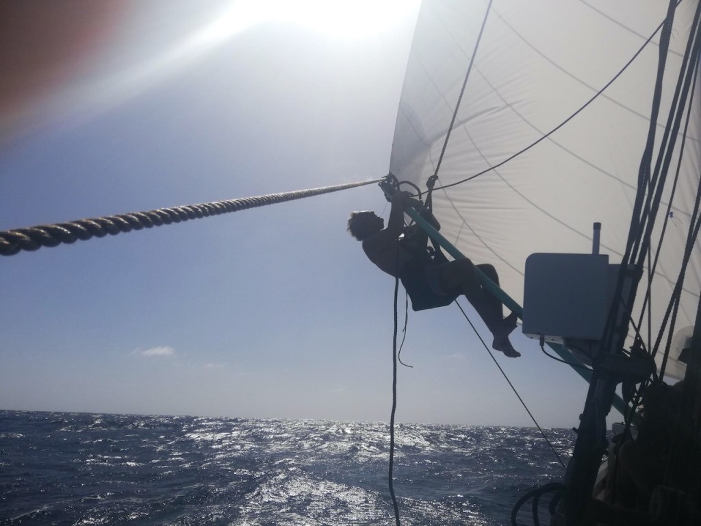 Auch die nächsten Tage waren herrlich und auch hier wurde wieder Sport getrieben, allerdings ohne Unterbrechungen, schade. Stattdessen ließ der Wind etwas nach und wehte vor allem Nachts nur noch mit 2 oder 3 Windstärken. Die Etmale (zurückgelegte Distanz von Mittag zu Mittag) schrumpften erstmals unter 100 Seemeilen und die flappenden Segel hebten die Stimmung nicht gerade an. Ein Glück, dass wir alle so guter Dinge waren und uns auch nach mysteriösen Bootsichtungen bei Nacht immer noch nicht die Stimmung verhageln ließen. Besagtes Boot näherte sich ohne AIS (Automatic Identification System) auf wenige hundert Meter, richtete seine Scheinwerfer auf uns und verschwand anschließend so schnell wie es gekommen war. Auch die spontan einberufene Krisensitzung konnte keine qualitativeren Mutmaßungen als „Piraten?“ hervorbringen