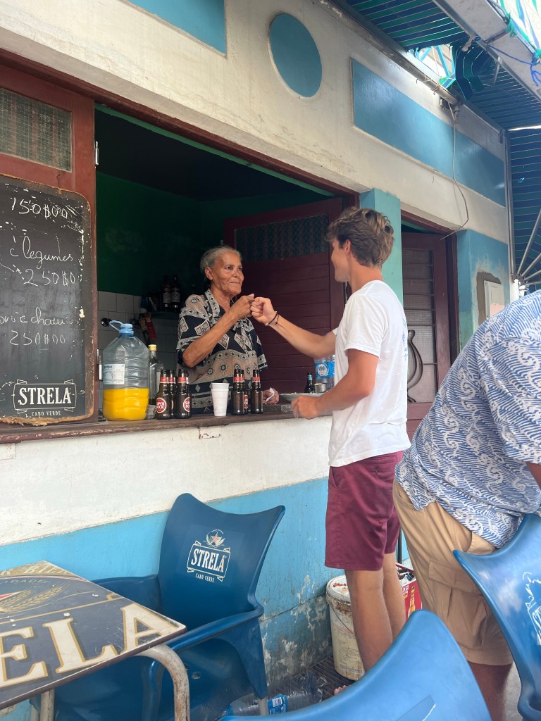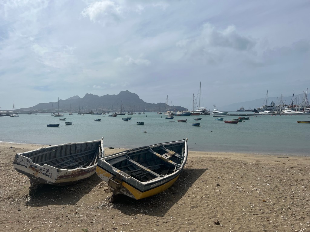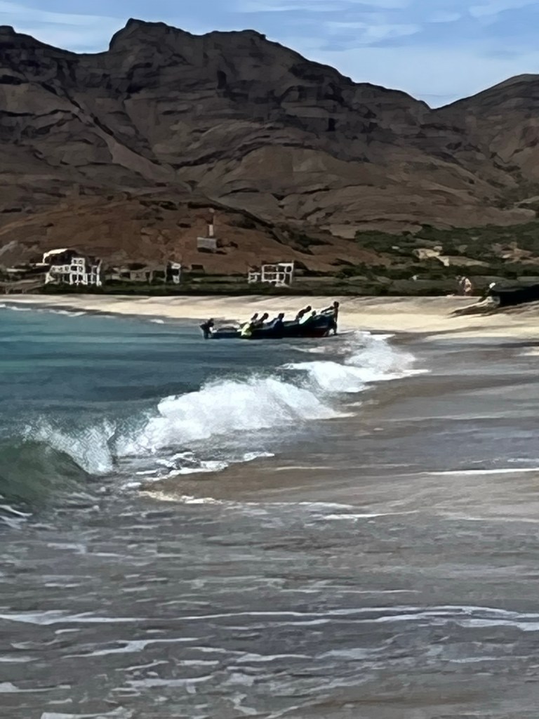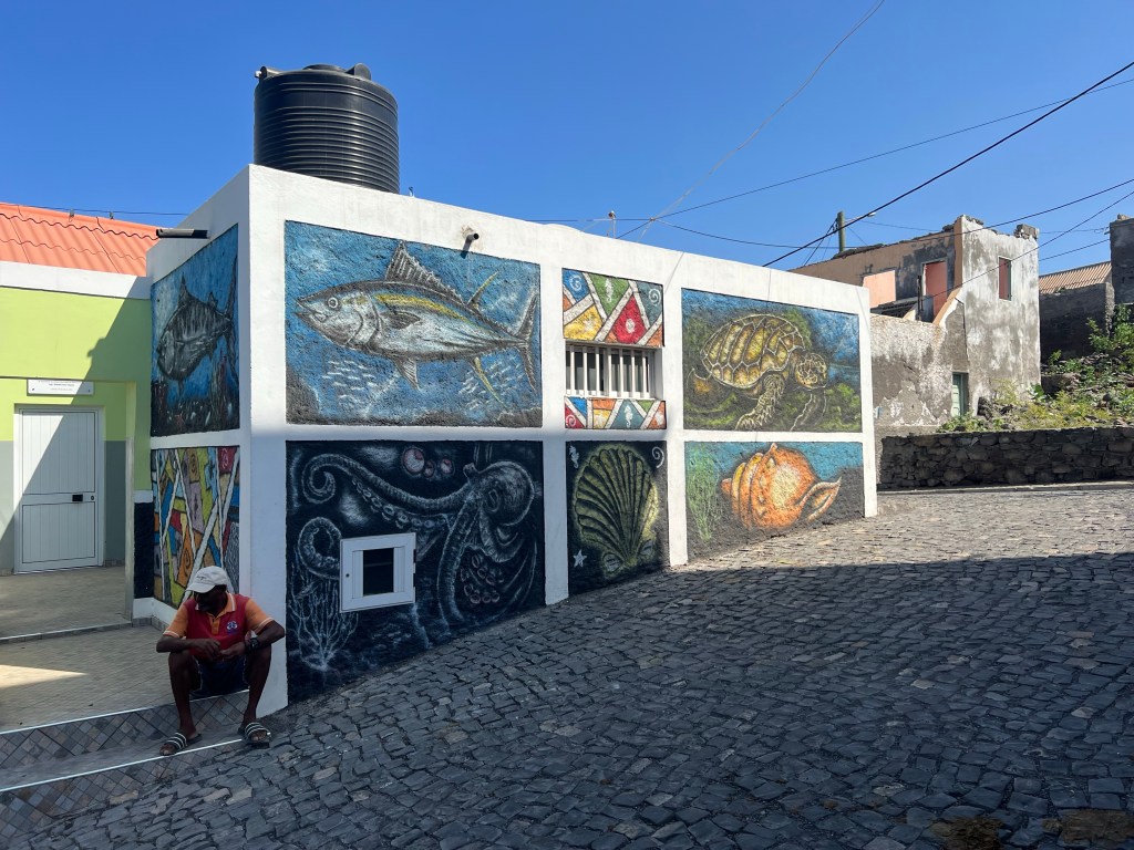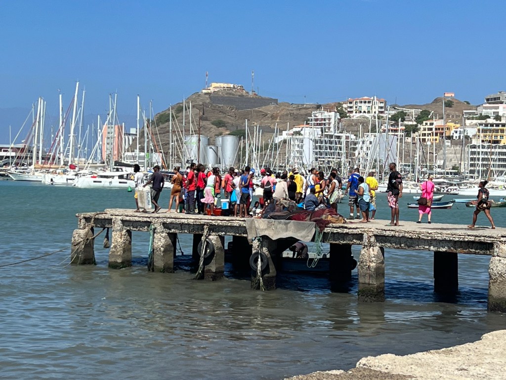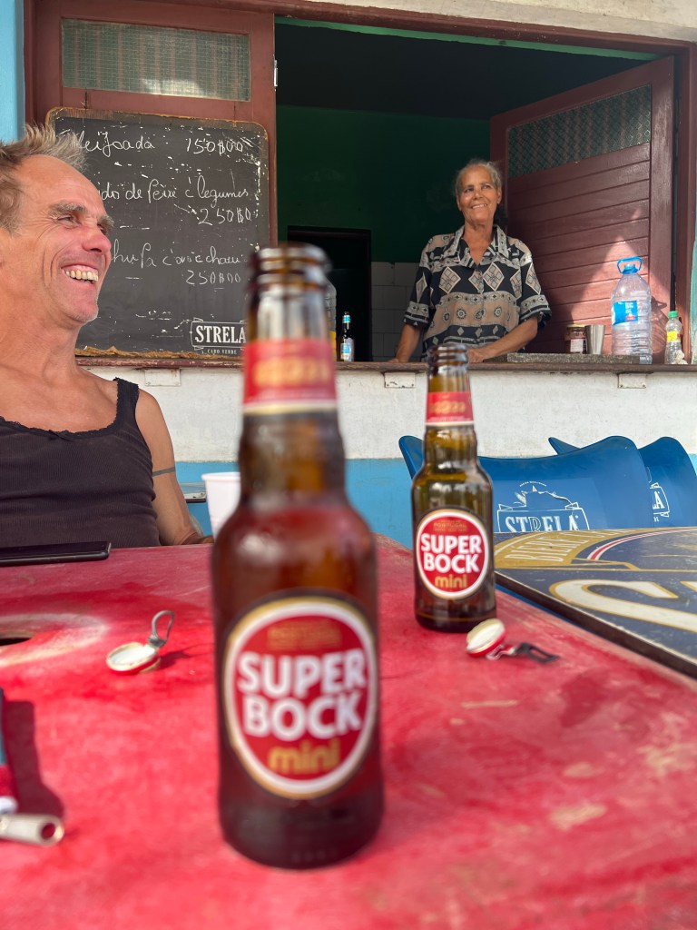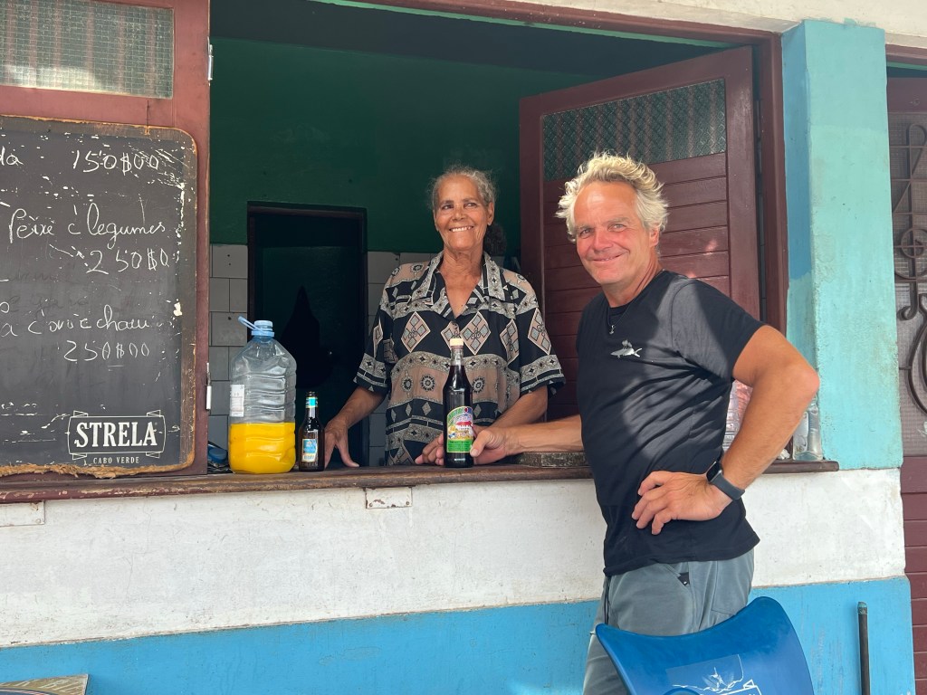 Hier residiert Samba, König des Marktes, sehr dunkelhäutig, würdevoller Kahlkopf, Sonnenbrille, langes einfarbiges Gewand – sein Bruder lebt in München (auf 450.000 Einwohnerinnen auf den Inseln kommen 720.000 Emigrant*innen im Ausland – das Leben auf den Inseln ist und war nie einfach… und die Rücküberweisungen sind auch für die Republik Cabo Verde ein wichtiger Wirtschaftsfaktor: Ohne Überweisungen aus dem Ausland haben es Familien hier schwer…). Samba spricht flüssig deutsch – über die Verhältnisse auf den Inseln – nicht zu viel Korruption – die lokale Wirtschaft und Politik, aber vor allem das Leben der Menschen – sehr liebenswert mit seiner ruhigen, humorvollen Art – über die Zeit entsteht eine kleine Freundschaft.
