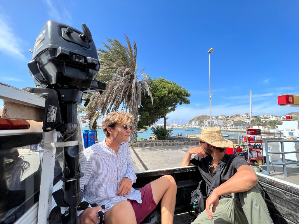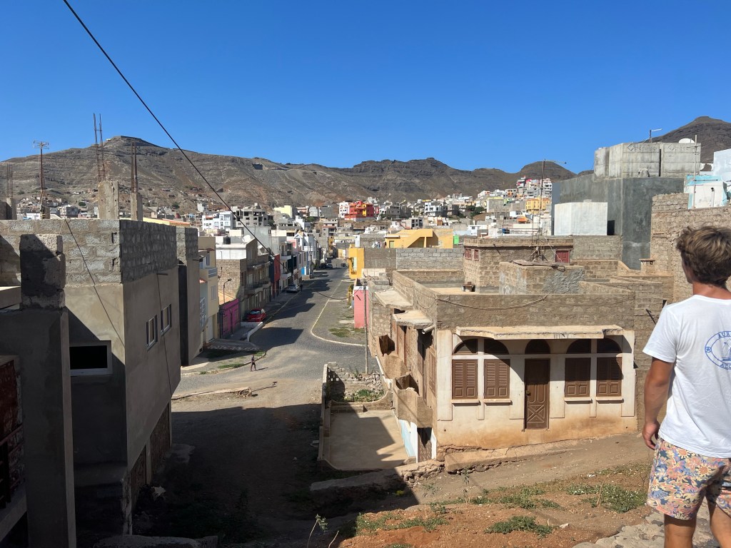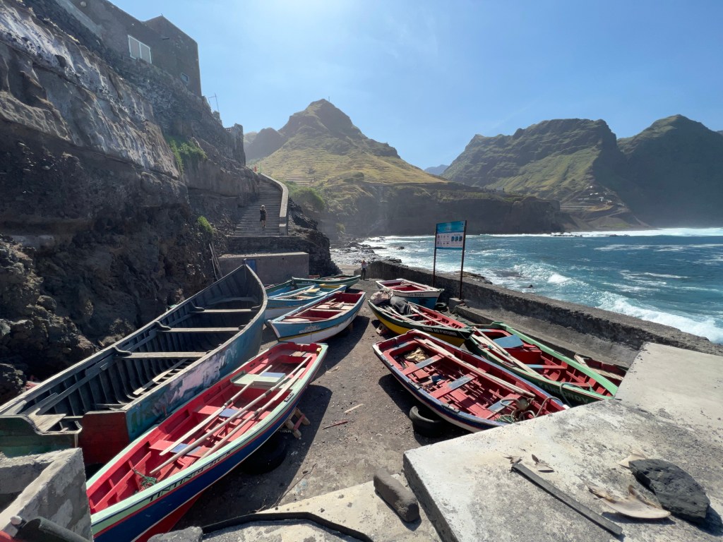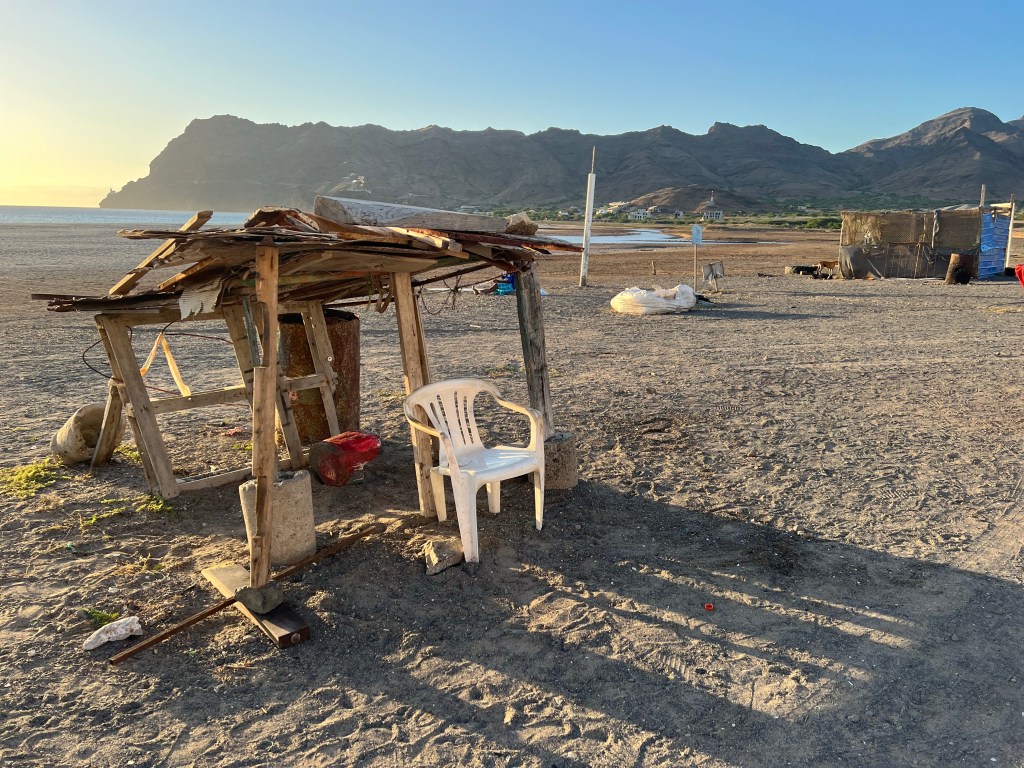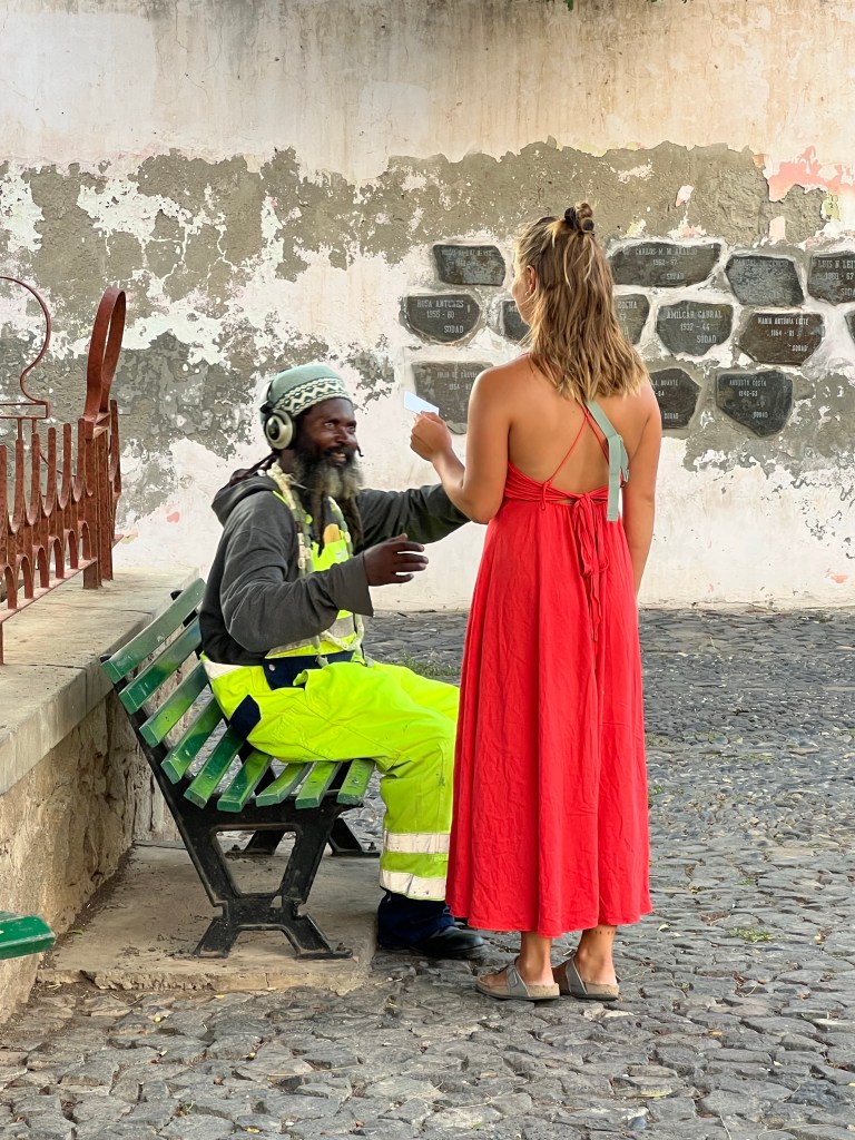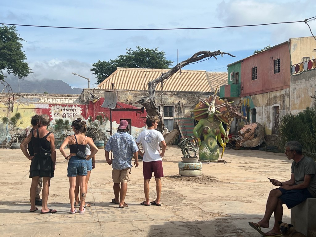 Hier residiert Samba, König des Marktes, sehr dunkelhäutig, würdevoller Kahlkopf, Sonnenbrille, langes einfarbiges Gewand – sein Bruder lebt in München (auf 450.000 Einwohnerinnen auf den Inseln kommen 720.000 Emigrant*innen im Ausland – das Leben auf den Inseln ist und war nie einfach… und die Rücküberweisungen sind auch für die Republik Cabo Verde ein wichtiger Wirtschaftsfaktor: Ohne Überweisungen aus dem Ausland haben es Familien hier schwer…). Samba spricht flüssig deutsch – über die Verhältnisse auf den Inseln – nicht zu viel Korruption – die lokale Wirtschaft und Politik, aber vor allem das Leben der Menschen – sehr liebenswert mit seiner ruhigen, humorvollen Art – über die Zeit entsteht eine kleine Freundschaft.