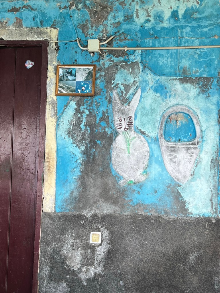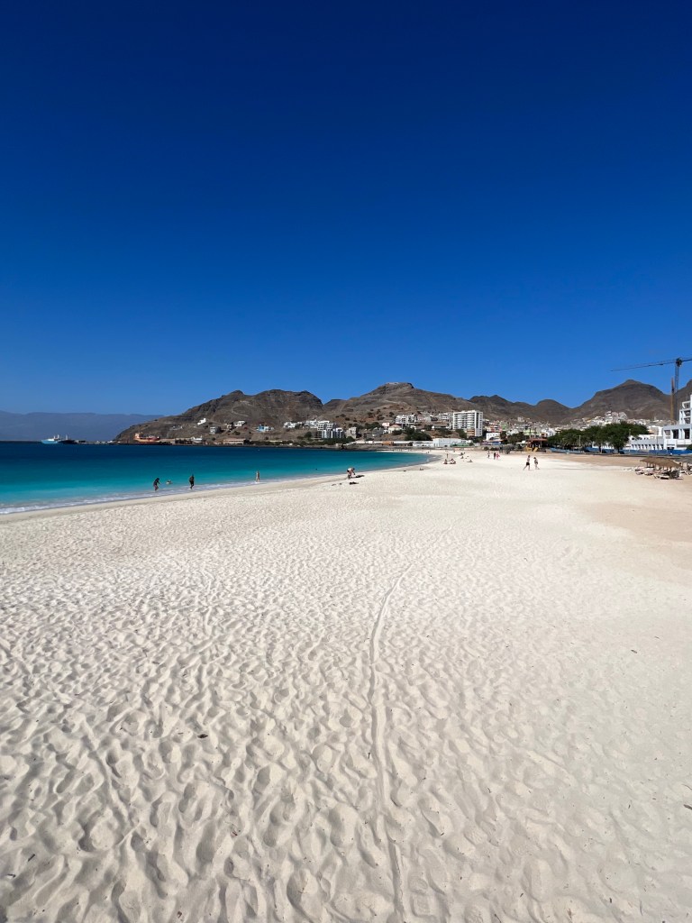 regionale – Vino branco, viel Agua – probieren, was die Cabo Verde Küche kann: Die gehobene (für Leute mit eigenem Auto und Besucherinnen) wird von Fisch und anderem Meeresgetier dominiert – wächst ja nix, auch kein Futter für Viecher. Die Bevölkerung ißt in erster Linie Bohnen, Mais, Reis, Getreide. Da kommt dann gerne etwas Fisch rein und vielleicht ne Zwiebel oder Tomate, Pepperoni und Koriander – neben Rosmarin das einzige Würzkraut. In der Strandbar gibt es Pasteis – Teigtaschen aus Weizen und Fisch. Sehr lecker – kriegen wir immer wieder auf den Inseln, auch aus Kartoffeln und Balcalau. Das Volksessen heißt Cachupa – relativ trockener Eintopf aus verschiedenen Bohnen und Mais – in dieser Grundvariante sogar vegan! Wer sich’s leisten kann, kriegt einige Scheiben scharf gebratene Salsicha und ein Spiegelei dazu. Die beste Cachupa (wir essen die oft schon zum Frühstück) gibt es auf dem Markt: Der Markt ist ein großzügiger, angelegter, quadratischer Platz mit Budengassen und Dächern für die Gemüsehändlerinnen an den 4 Ecken. In der Mitte des Platzes in einer abgetreppten Vertiefung ein sechseckiger Pavillon. An fünf Seiten, fünf Minirestaurants – im Gebäude jeweils die Küchen, davor auf den Stufen die Tische und Sonnenschirme, die sechste Seite beherbergt die einschalige Markttoilette. Das ganze bröckelnde Ensemble erinnert an vergangene Zeiten – Erbstück aus den sozialistischen Zeiten?