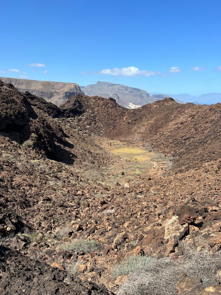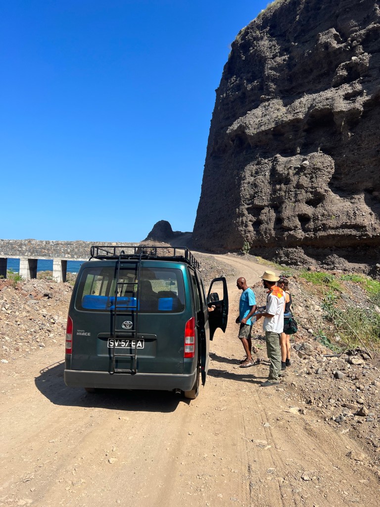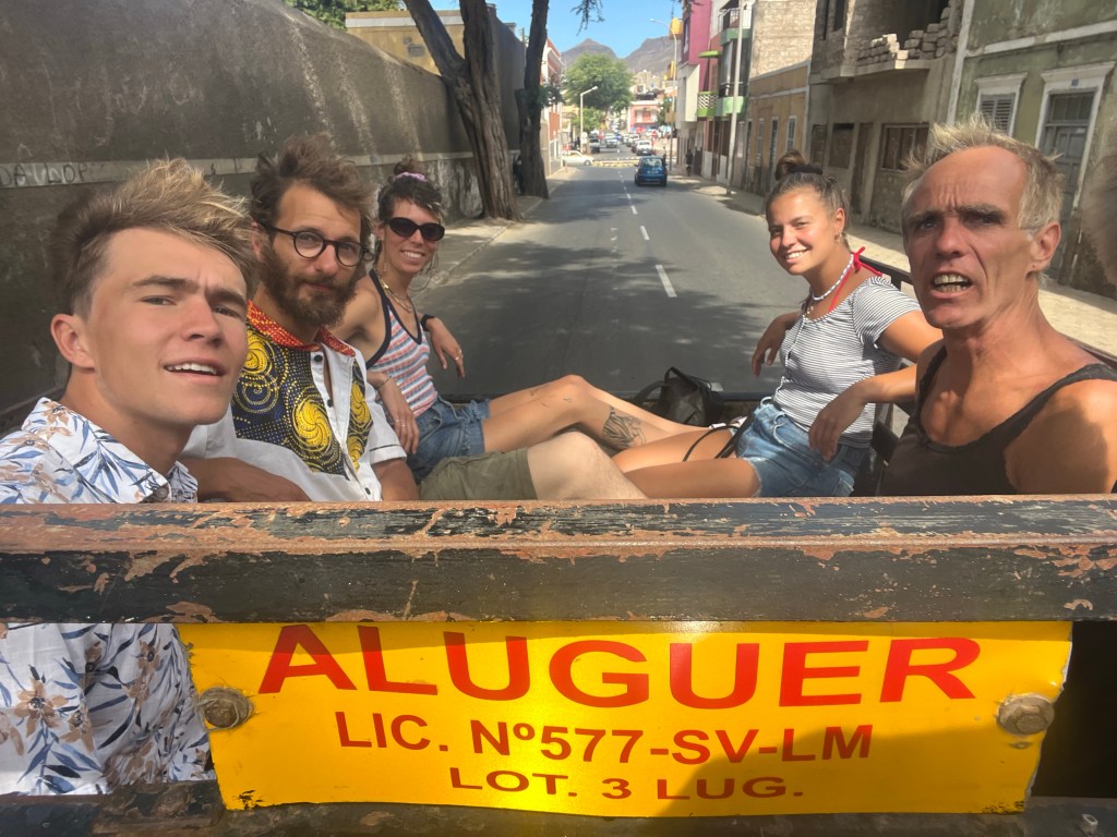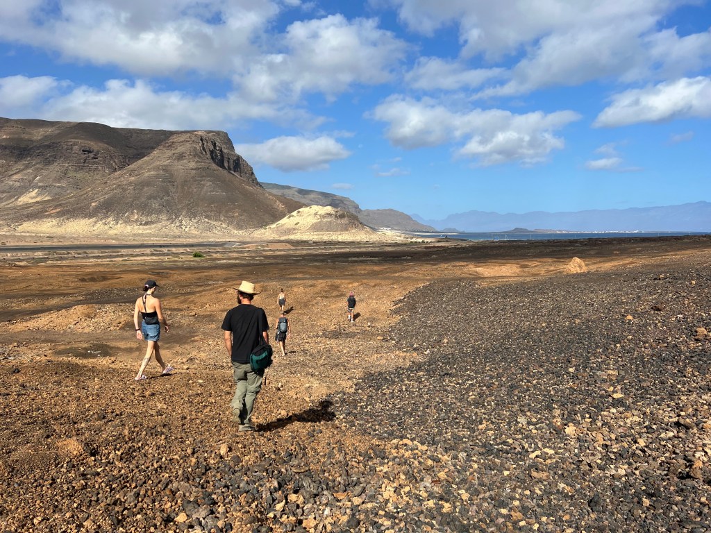Mindelo mit kleinem Containerkai, ab und zu ein Kreuzfahrtschiff – auf Sao Vincente gibt es eigentlich sonst nichts. Sahelzone, steinige Wüste – 5 Regentage im Jahr, 100mm – wir bekommen kaum einen grünen Halm zu sehen, während wir per Aluguer über die Pisten schraddeln. Die Kisten sind alle total auf, klappern und rattern herzerweichend unter dem Gewicht von bis zu 17 Erwachsenen plus Dachlast. Die Fahrer und die Fahrgästinnen sind guter Dinge, da sind wir es auch. Vor den Fenstern Steine und Staub und Lava in verschiedenen Farben. Über ausgedehnte bröckelige Lavafelder schottern wir uns auf einen Vulkankegel. In dieser Landschaft gibt es nichtmal Insekten und nur eine einzige Art Gewächs hat anscheinend eine Strategie gefundene – alle 150 Meter versteckt sich ein Sträuchlein in den Lavaspalten.
