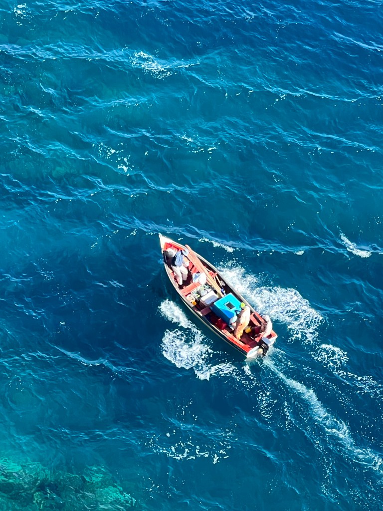 Dieweil pendeln die Fischerboote zwischen Strand und Pferch. Snorkling Equipment kann ausgeliehen werden, steter Strom aus Taxis und Kleinbussen, über den weiten Strand, umringt von knackigen Jungs, in die Brandung – „was?“ – mit hoch erhobenem Rucksack, alles über die Bordwand gehievt, Außenborder, schiebt raus, 15 Minuten Aufenthalt dann retour.