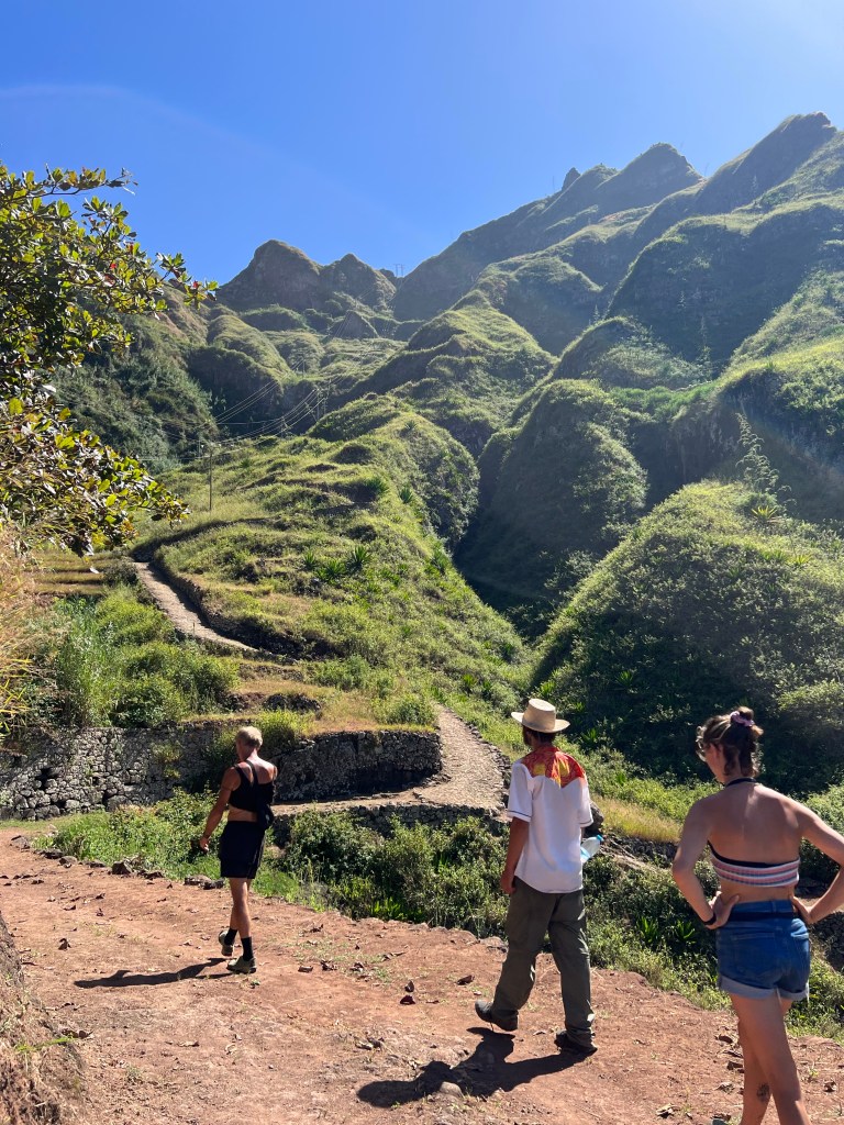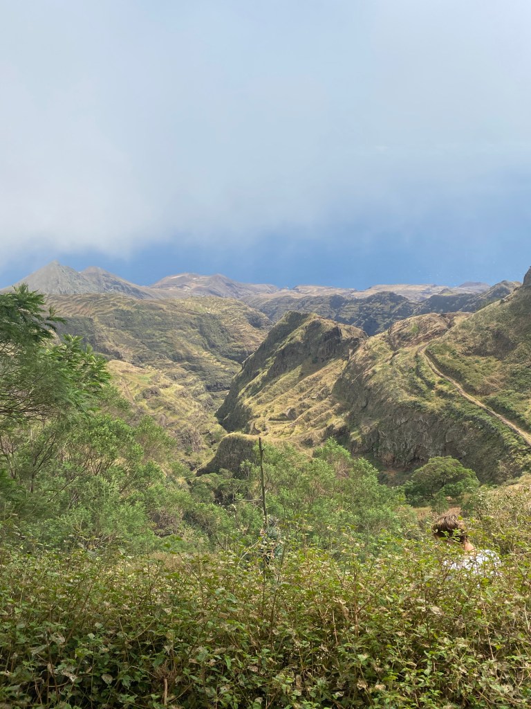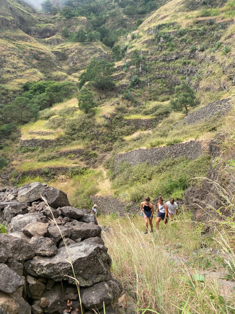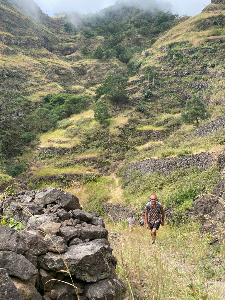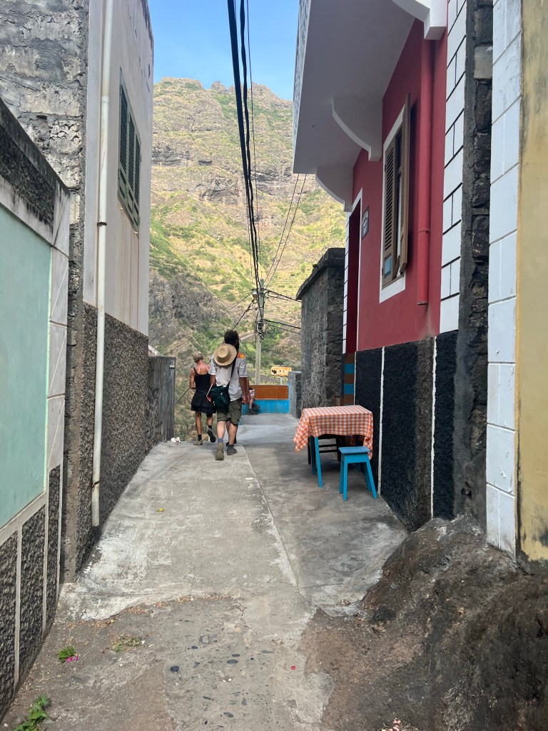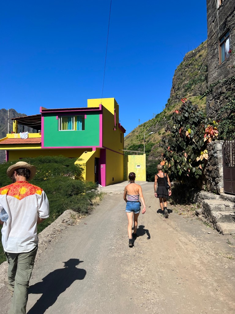 Die zweite Ausfahrt nach Sao Antao dann mit Übernachtung in der Pousada „Green Place“ die wir von Mindelo aus per booking.com reservieren. Nachdem Jesper am Tag nach der ersten Wanderung mit Magen/Darm im Bett lag, wird jetzt Chiara krank. Kurz später noch Lotta. Green Place? Ja- der Name steht auf englisch am grünen Haus in den grünen Bergen, terrassierte, steile Hänge, inmitten Bananenpflanzungen und Zuckerrohr. Vor drei Jahren haben sie eröffnet und offensichtlich Corona überstanden. Mehrere Häuschen mit einfachen Zimmern, eins mit Küche und Speiseraum, Terrasse mit phantastischem Blick in die Berge, kleiner Pool (bei der Wasserknappheit?). Carlos lässt uns auf dem Berg raus, bringt die Kranken und Lahmen direkt zum Green Place. Der Rest steigt 800m auf altem Weg ab. Erst hochgebirgig, dann durchs Kulturland die ganze Zeit unglaublich malerisch, schön, begeisternd. Wir verpassen mal wieder die Abzweigung, fragen bei den Bäuer*innen – Pousada Green place kennt hier keine – aber wir haben das leuchtend grüne Ensemble schon von hoch droben gesichtet – immer bergab – an den unteren Hängen sind überall Wege und alte gepflasterte „Straßen“.