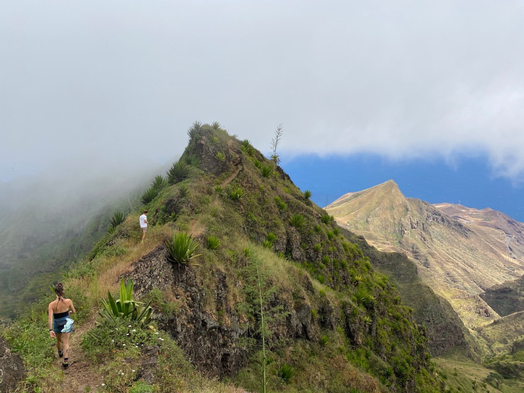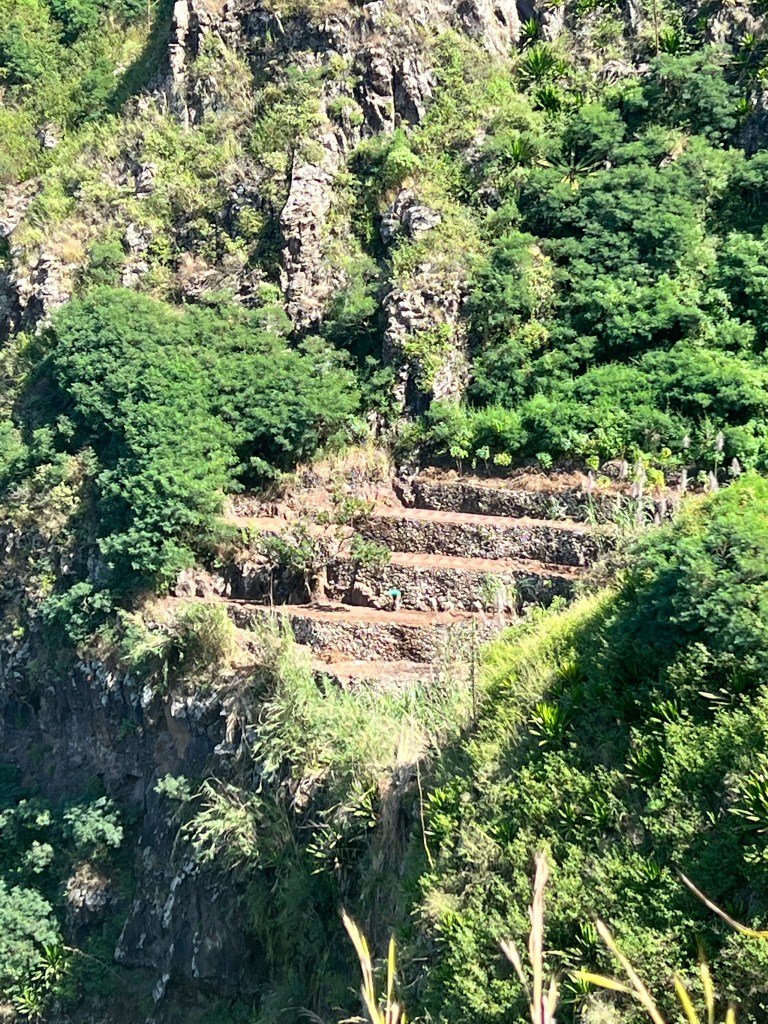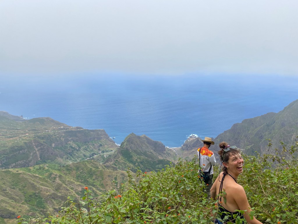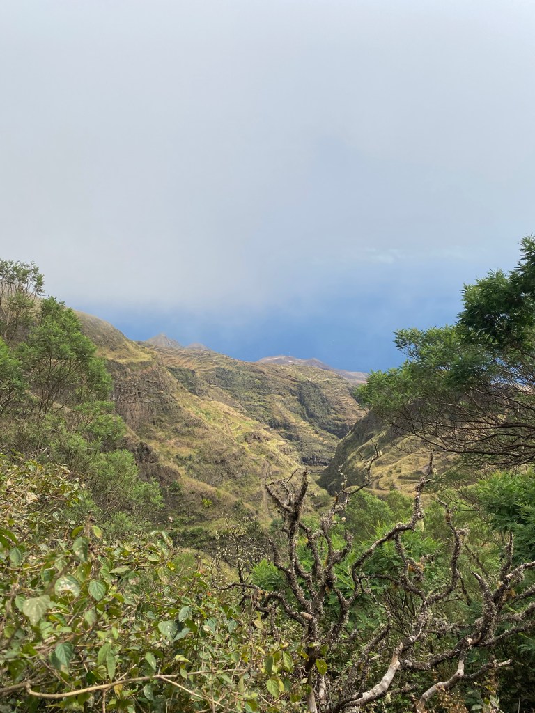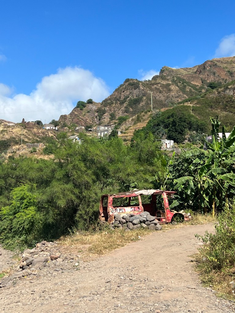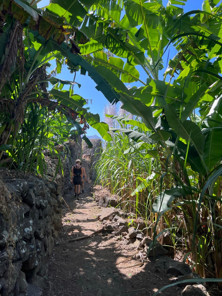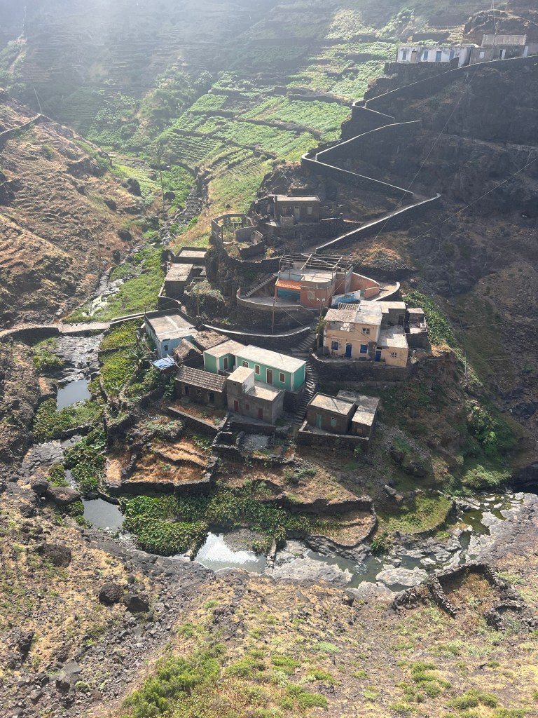 Die zweite Ausfahrt nach Sao Antao dann mit Übernachtung in der Pousada „Green Place“ die wir von Mindelo aus per booking.com reservieren. Nachdem Jesper am Tag nach der ersten Wanderung mit Magen/Darm im Bett lag, wird jetzt Chiara krank. Kurz später noch Lotta. Green Place? Ja- der Name steht auf englisch am grünen Haus in den grünen Bergen, terrassierte, steile Hänge, inmitten Bananenpflanzungen und Zuckerrohr. Vor drei Jahren haben sie eröffnet und offensichtlich Corona überstanden. Mehrere Häuschen mit einfachen Zimmern, eins mit Küche und Speiseraum, Terrasse mit phantastischem Blick in die Berge, kleiner Pool (bei der Wasserknappheit?). Carlos lässt uns auf dem Berg raus, bringt die Kranken und Lahmen direkt zum Green Place. Der Rest steigt 800m auf altem Weg ab. Erst hochgebirgig, dann durchs Kulturland die ganze Zeit unglaublich malerisch, schön, begeisternd. Wir verpassen mal wieder die Abzweigung, fragen bei den Bäuer*innen – Pousada Green place kennt hier keine – aber wir haben das leuchtend grüne Ensemble schon von hoch droben gesichtet – immer bergab – an den unteren Hängen sind überall Wege und alte gepflasterte „Straßen“.