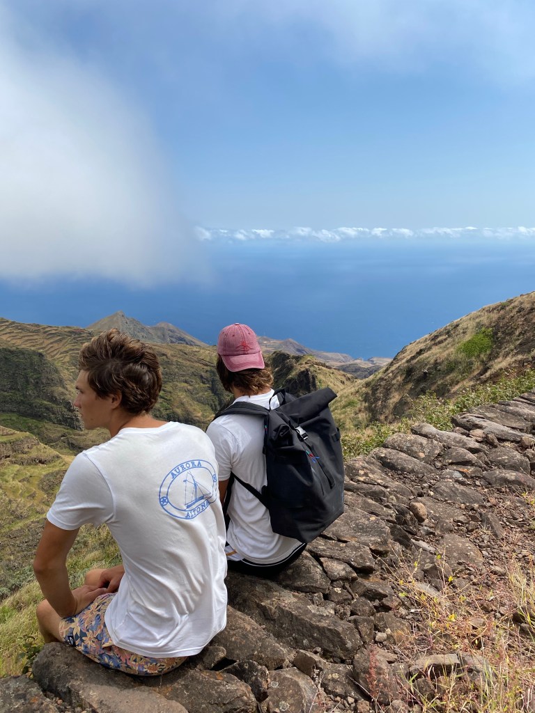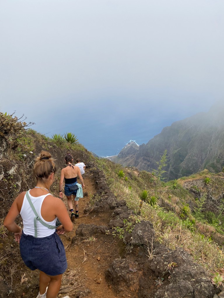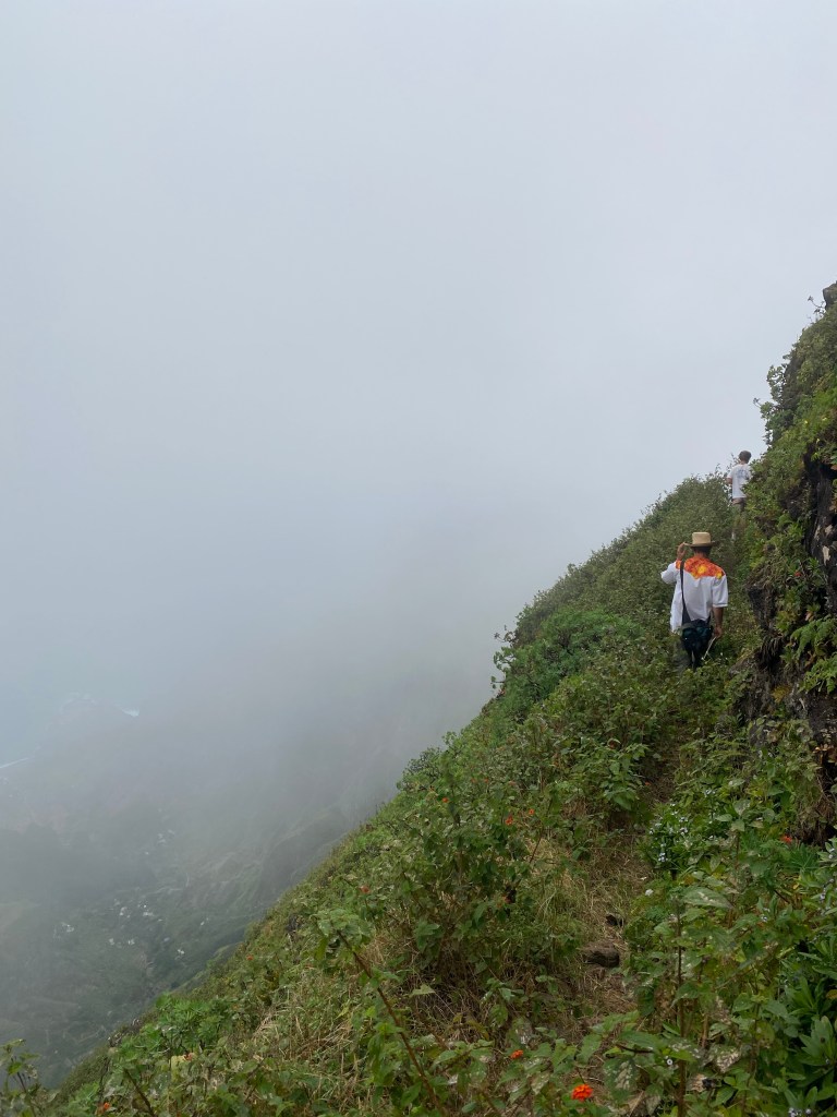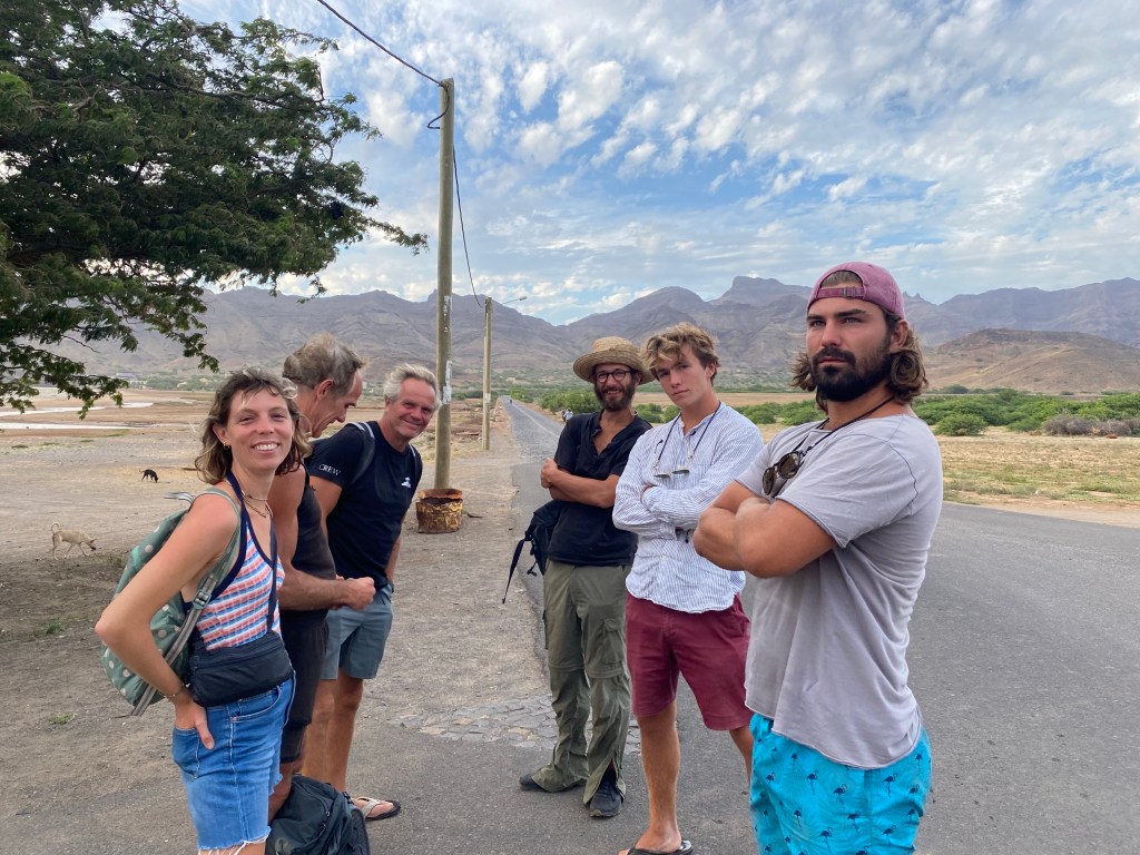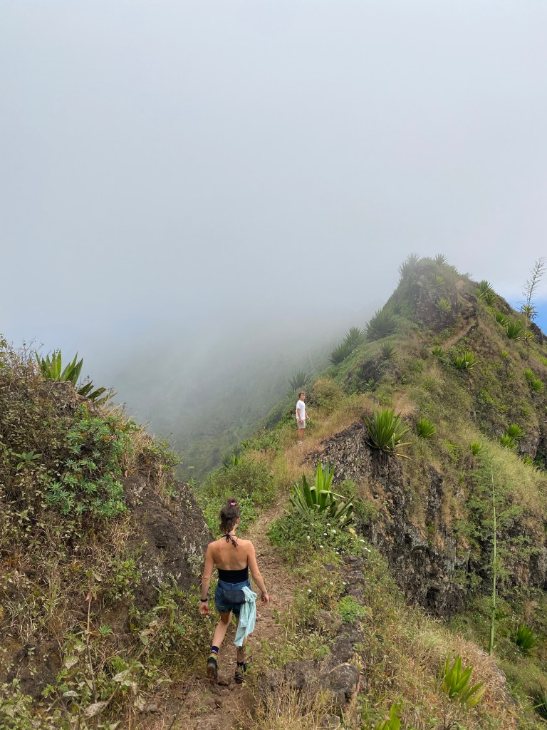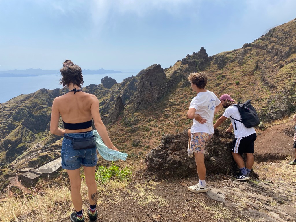 Die zweite Ausfahrt nach Sao Antao dann mit Übernachtung in der Pousada „Green Place“ die wir von Mindelo aus per booking.com reservieren. Nachdem Jesper am Tag nach der ersten Wanderung mit Magen/Darm im Bett lag, wird jetzt Chiara krank. Kurz später noch Lotta. Green Place? Ja- der Name steht auf englisch am grünen Haus in den grünen Bergen, terrassierte, steile Hänge, inmitten Bananenpflanzungen und Zuckerrohr. Vor drei Jahren haben sie eröffnet und offensichtlich Corona überstanden. Mehrere Häuschen mit einfachen Zimmern, eins mit Küche und Speiseraum, Terrasse mit phantastischem Blick in die Berge, kleiner Pool (bei der Wasserknappheit?). Carlos lässt uns auf dem Berg raus, bringt die Kranken und Lahmen direkt zum Green Place. Der Rest steigt 800m auf altem Weg ab. Erst hochgebirgig, dann durchs Kulturland die ganze Zeit unglaublich malerisch, schön, begeisternd. Wir verpassen mal wieder die Abzweigung, fragen bei den Bäuer*innen – Pousada Green place kennt hier keine – aber wir haben das leuchtend grüne Ensemble schon von hoch droben gesichtet – immer bergab – an den unteren Hängen sind überall Wege und alte gepflasterte „Straßen“.
