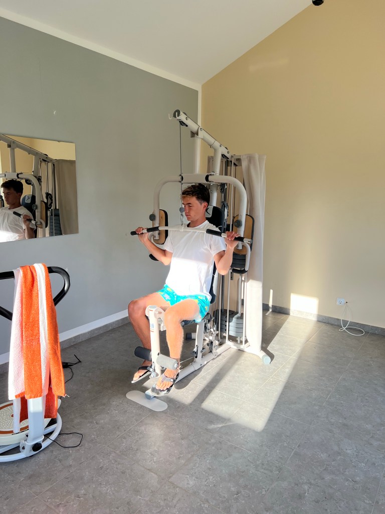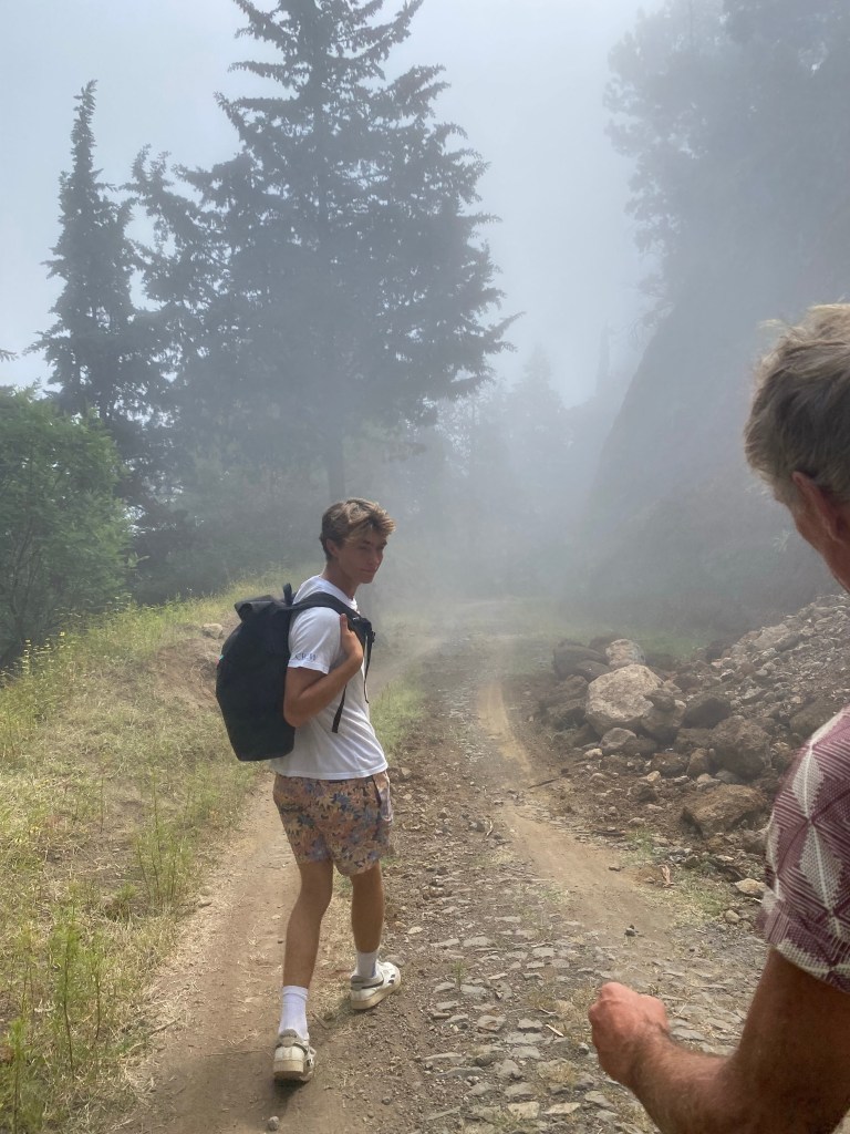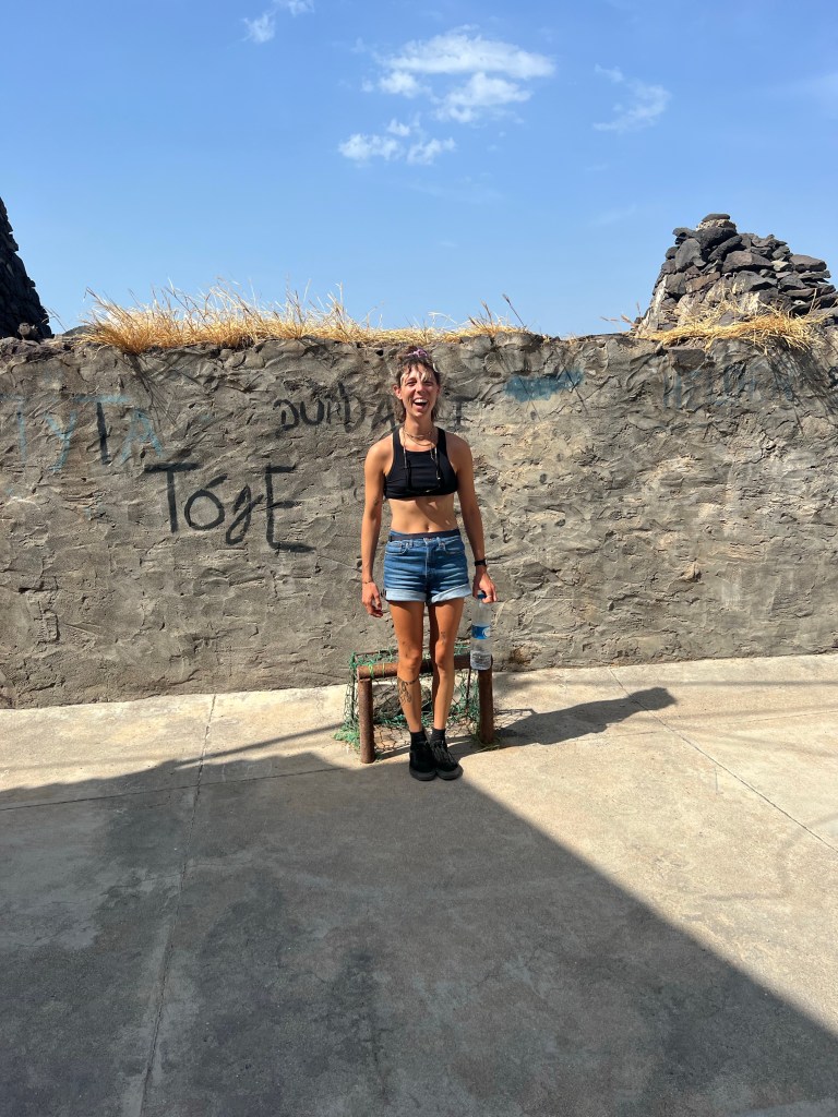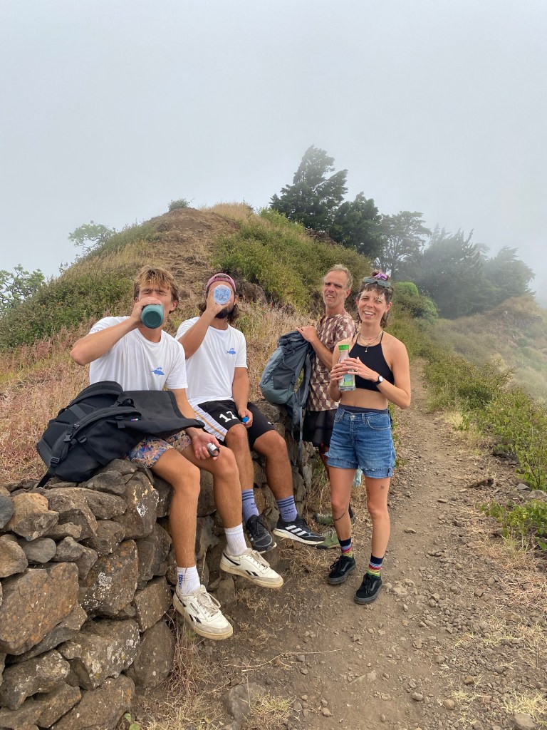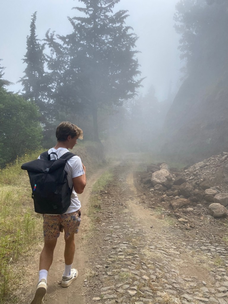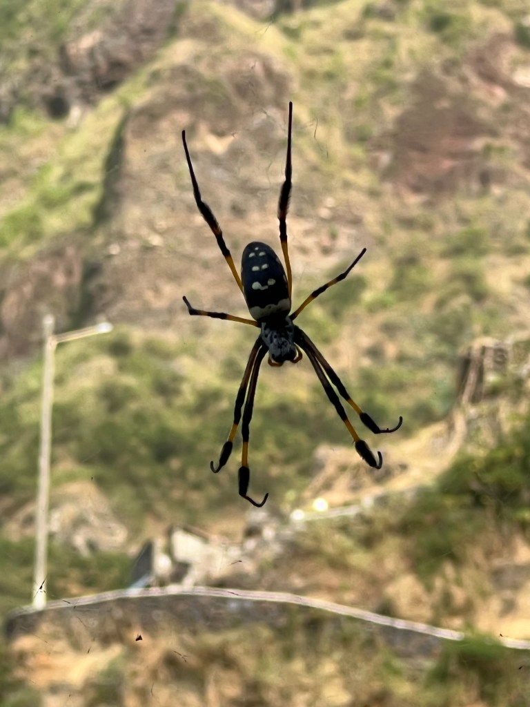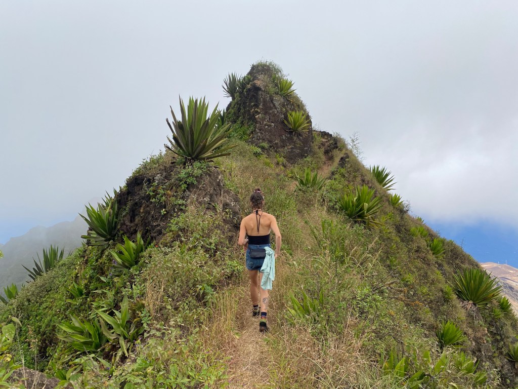 Die zweite Ausfahrt nach Sao Antao dann mit Übernachtung in der Pousada „Green Place“ die wir von Mindelo aus per booking.com reservieren. Nachdem Jesper am Tag nach der ersten Wanderung mit Magen/Darm im Bett lag, wird jetzt Chiara krank. Kurz später noch Lotta. Green Place? Ja- der Name steht auf englisch am grünen Haus in den grünen Bergen, terrassierte, steile Hänge, inmitten Bananenpflanzungen und Zuckerrohr. Vor drei Jahren haben sie eröffnet und offensichtlich Corona überstanden. Mehrere Häuschen mit einfachen Zimmern, eins mit Küche und Speiseraum, Terrasse mit phantastischem Blick in die Berge, kleiner Pool (bei der Wasserknappheit?). Carlos lässt uns auf dem Berg raus, bringt die Kranken und Lahmen direkt zum Green Place. Der Rest steigt 800m auf altem Weg ab. Erst hochgebirgig, dann durchs Kulturland die ganze Zeit unglaublich malerisch, schön, begeisternd. Wir verpassen mal wieder die Abzweigung, fragen bei den Bäuer*innen – Pousada Green place kennt hier keine – aber wir haben das leuchtend grüne Ensemble schon von hoch droben gesichtet – immer bergab – an den unteren Hängen sind überall Wege und alte gepflasterte „Straßen“.