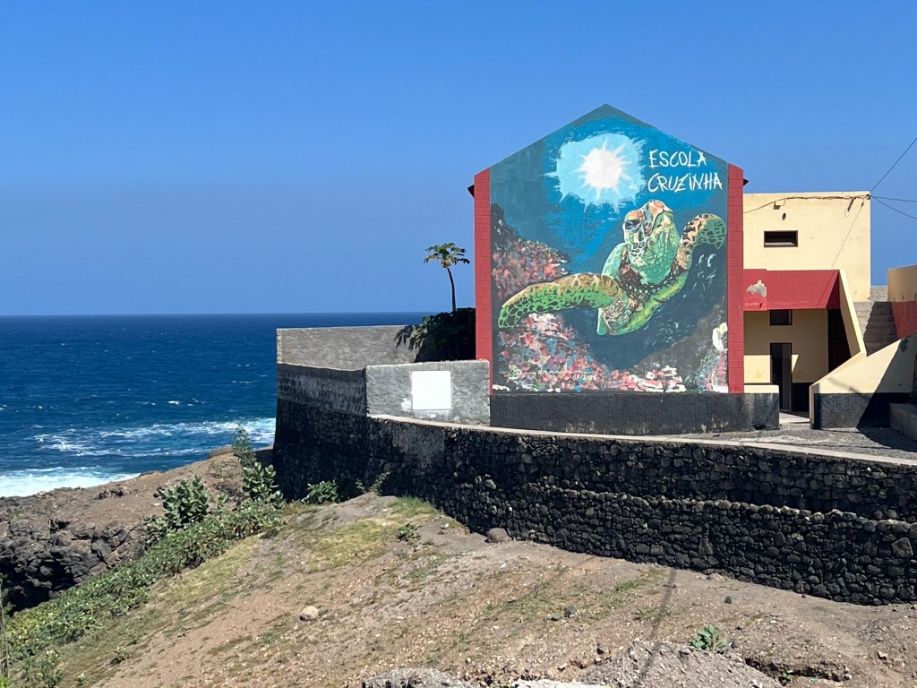 Frauen lernen wir auch kennen – die Frauen, die im Café Mindelo arbeiten und in anderen Lokalen, auf dem Markt, im Café Royal – die langsamste Bedienung der Welt… Wir werden erkannt, begrüßen uns, reden auch über die Bestellung hinaus ein paar Sätze, von einigen verabschieden wir uns sogar, als wir abfahren. Aber wirklich erfahren hat von uns keine viel über die Welt der Frauen auf den Inseln. Schade! Und typisch – und auch klar: 2 Wochen, von denen wir mehrere Tage am Schiff arbeiten reichen nur um an der Oberfläche zu kratzen. Und die Sprachbarriere kommt zur Kulturbarriere dazu…. ach ja – spannender Ankerpunkt noch das Kulturzentrum am Hafen, wo wir leider nicht in eine Theatervorstellung kommen – seit Wochen ausverkauft. Es gibt offensichtlich eine rege Kulturszene, die aber ziemlich mit sich beschäftigt ist – zumindest gelingt bis auf kurze Gespräche kein weiter gehender Kontakt.