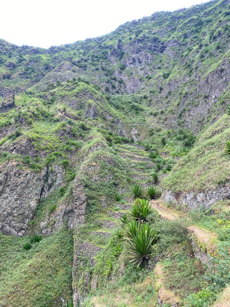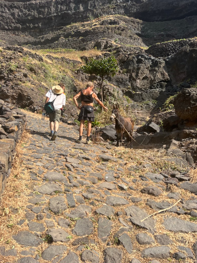 Im Green Place außer uns zwei jüngere Pärchen und eine gemischt französisch/schweizerische Reisegruppe, die morgens von einer kreolischen Guidin(!) abgeholt wird. Offensichtlich arbeitet Green Place nicht nur mit booking com zusammen, sondern auch mit internationalen Reiseveranstaltern. Im Gegensatz zu den wenigen Touristinnen auf Sao Vincente – viele Seglerinnen – sichten wir auf Sao Antao wiederholt Trekking-Reisende. Auch wir latschen (ziemlich underequiped und selig) so manchen Kilometer über die atemberaubend schöne Insel. Nordküstenwanderung von Cruzinho nach Proto da Cruz: Stundenlang auf dem alten gepflasterten Weg, schwindelnd hoch über der Brandung am Felsen klebend, kurz später am Fuß der Steilwände dicht am Wasser, steil hoch, steil runter, übersäht mit Steinen und Felsen – Capverdisches Roulette, atemberaubend schön. Ein wegloser Gebirgskamm schneidet die Nordküste vom Inland ab. Trotzdem laufen wir immer wieder durch winzige Siedlungen oder Ruinen. Die Seeseite ist sehr schroff und steil, an ihrem Fuß ziemlich grün, wo es irgend ging terrassiert. Inzwischen liegen viele Terrassen brach. Einziger Zuweg der Siedlungen ist unser Wanderweg, viele Kilometer lang, viele 100 Höhenmetern zu überwinden. Einzige Transportmittel Esel und Menschen.