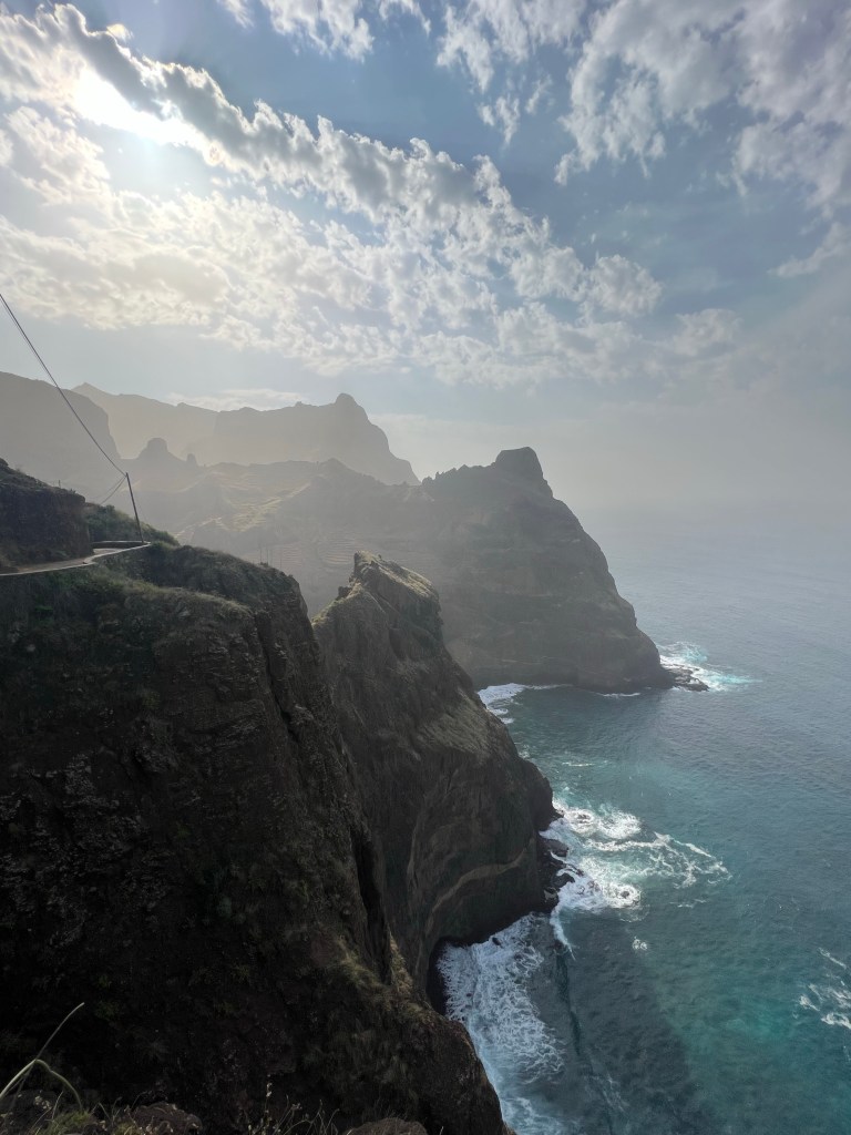 Die Nordküstenwanderung endet in Porto da Cruz, für uns selbstverständlich am Hafen („another place you better visit from landsite“), eine Mole in den Klippen, breiter, schneeweißer Brandungsgürtel davor, kleiner quirliger Topf dahinter und eine Slipbahn; permanentes Dröhnen der Brandung, Salzdunst. Sehr idyllisch – vom winzigen Restaurant am Klippenrand aus betrachtet, wie die offenen Boote, in tollkühner Fahrt um den Molenkopf schlüpfen, dann entspannt im quirligen Wasser warten, bis 10 Männer zusammenlaufen, dann gemeinsam das Boot die Rampe hoch schleifen. Sogleich wird der Fisch verkauft oder verteilt und dann hocken überall in den Klippen Männer, die, umlungert von dünnen Katzen, Fische putzen. Wir treffen Tom und Jesper, die den Tag ruhiger angehen lassen. Chiara ist inzwischen richtig krank, liegt in der Pousada im Bett. Wir bleiben noch eine Nacht im Green place.