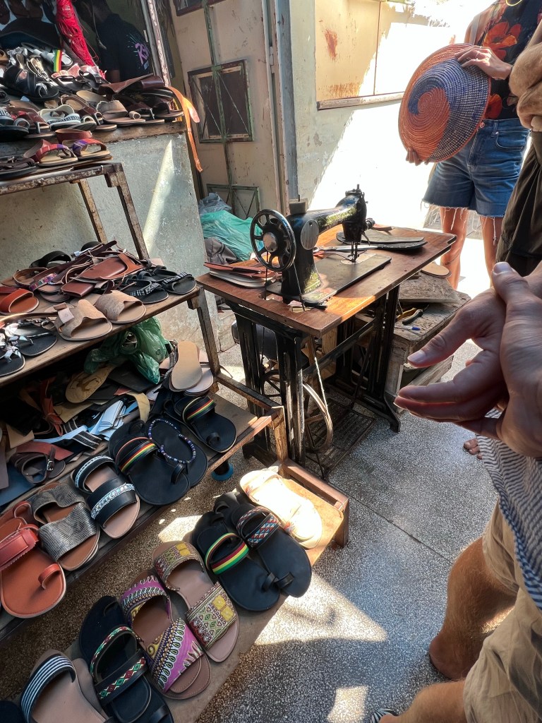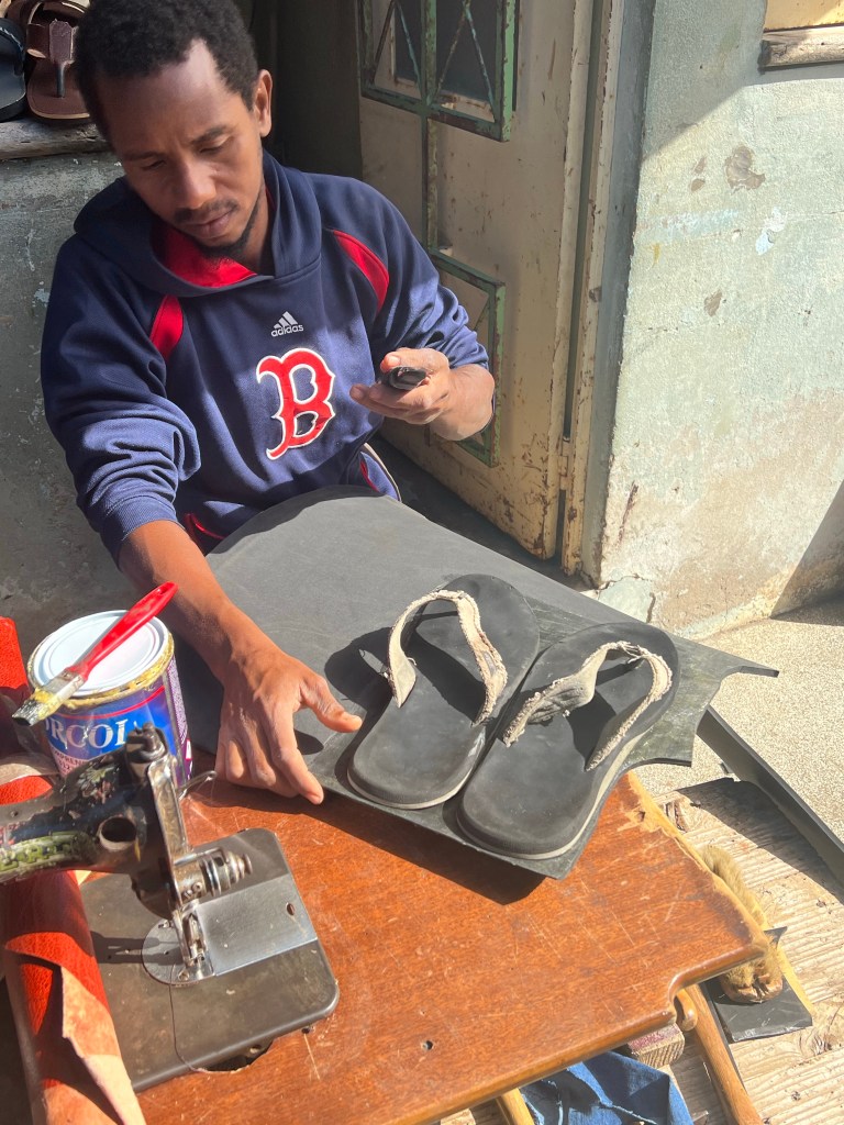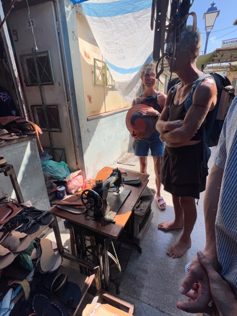 Die Männer sind die Fischer, die Securitys, die überall rumstehen, im Supermarkt, vor dem Café, die Taxi- und Aluguerfahrer (Aluguer sind Sammeltaxis, die viele außerstädtische Buslinien bedienen, Pickups mit Bänken auf der Ladefläche oder vollgestopfte Bullis) Männer sind sehr präsent auf den Straßen, kommunikativ gegenüber Fremden. Kontakt zu Frauen eher in Cafes und Lokalen, oder Supermärkten. Dort wird das Bild bestimmt von vielen taffen Frauen – alten wie jungen – leichter Spott im Augenwinkel, Haare gerne zum Dutt nach oben gebunden. Aber auch mal raspelkurz. Viel Kraushaar, dunkel, blondiert, viele Dreads. Selbstverständlich lieben wir den Markt, Budengassen, wo neben internationalem Plastikramsch auch Schneider und Schumacher (beides anscheinend Männerdomänen) ihre Dienste anbieten, regionales artesanato, Elektrogräte, Sonnenbrillen, aber auch Stühle und Betten, Gemüse natürlich auch und Obst – so ziemlich alles, was es fürs Leben in Mindelo so braucht.