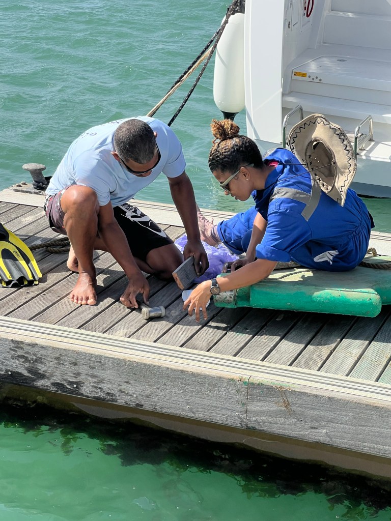 die ausgeschlagenen Ruderbuchsen erneuern (dazu aufslippen?), Aurora weiß anmalen (Sonnenschutzkleid) und diverse Kleinbaustellen und -projekte – normal. Die Ruderbuchsen geben den Takt vor, vielmehr Peter, ein dürrer, latent schlecht gelaunter Deutscher, der dem Repairteam (alles Kreol*innen) in der Marina vorsteht. Ruderbuchsen – kein Problem, im Wasser – sowas machen wir andauernd – aber: erst wenn die ARC weg ist! Das „betreute Segeln“ hat die gesamte Marina gebucht. Ist zwar noch kein Schiff angekommen von denen, aber: morgen müsst ihr wieder raus in die anchorage (das wiederum gibt der Hafenmufti vor, ein humpelnder dunkelhäutiger Pirat, der gut unterscheidet, wen er anbrüllt – die Crew – und wer freundlich behandelt wird – der Kapitän).