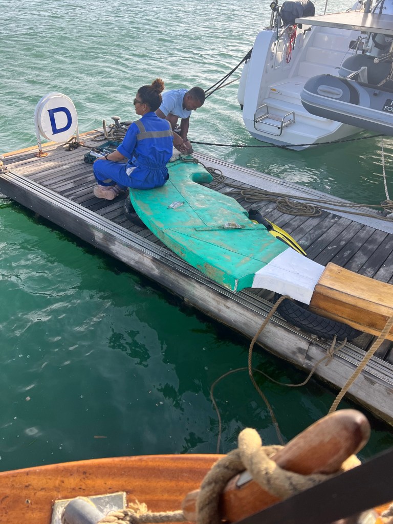 Mittwoch sind endlich die Buchsen drin und erstaunlich schnell gelingt im aufgewühlten Hafenwasser das Einfädeln des Ruderungetüms. Natürlich passt das Ganze nicht beim ersten Versuch – 1mm zu eng – alles wieder raus und die Monteurin zittert mit ihrem Taucher und den