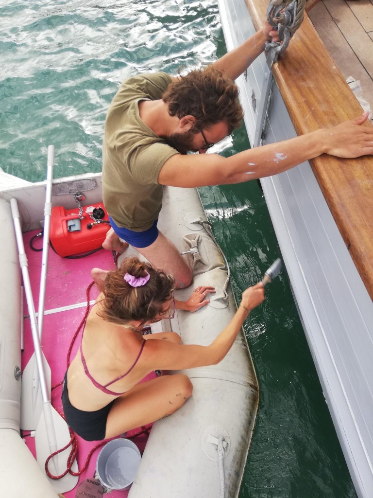Als wir Montag zurückkehren, vertreibt die Arbeit am Schiff die Grübelei: unbeeindruckt von der Schwabbelei in der Marina schleifen und malen wir Außenhaut und Schanz. Ein strammer NE fegt seit Tagen durch die Marina. Dazu steht – angeblich unüblich – eine ungemütliche Welle in der Bucht. Die Schiffe zerren an den Leinen. Aurora zerreißt 4 dicker Festmacher – bei den anderen Schiffen sieht es nicht besser aus. Das Laufen auf den Schwimmstegen ist ziemlich spannend und lustig anzusehen…