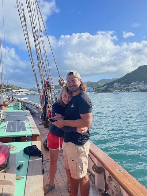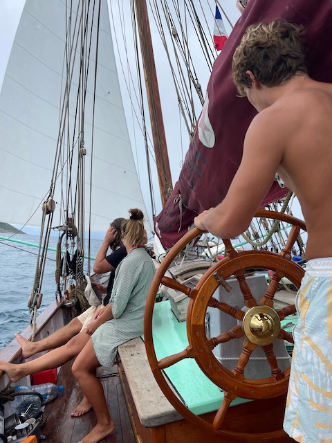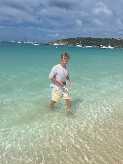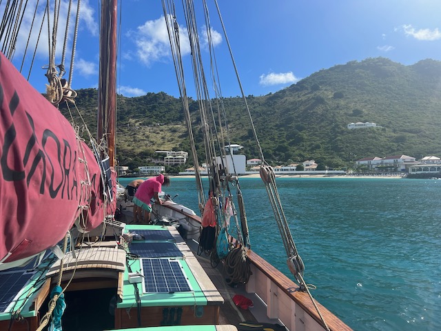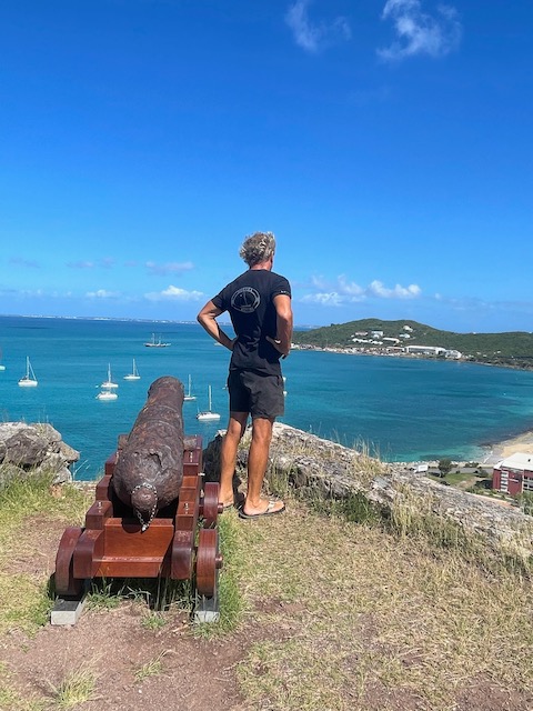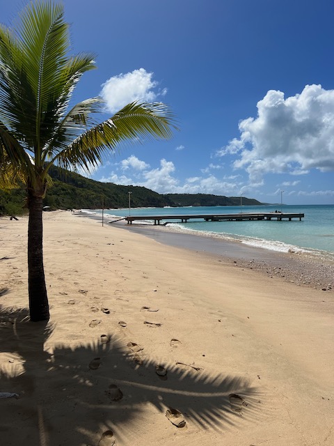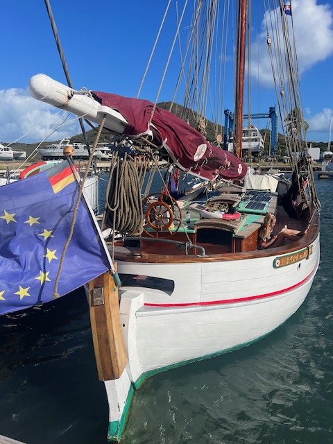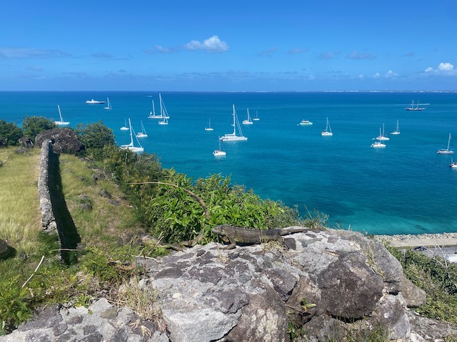 Um die tückischen Untiefen bedacht umschiffen zu können und trotzdem früh im europäischen Funknetz zu sein, lichten wir im Morgengrauen den Anker und schleichen los. Erst kurz vor unserem Ziel im Kanal bei Marigot laufen wir ein paarmal auf unmarkierten Flachs auf, kommen aber immer aus eigener Kraft wieder frei. Kaum hält der Anker, streben wir am Land. Alle außer Tom. Der muss für seine Uni Bewerbung einen Toefl-Test absolvieren, 4,5 Stunden, online mit strengen Kontrollen. Dafür das bezahlbare, stabile Funknetz.