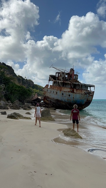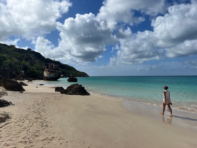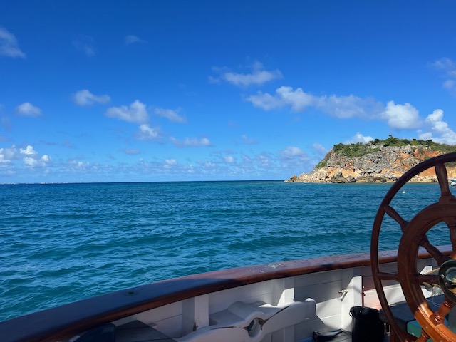 Späte Ankunft auf Anguilla – nächste Insel, nächstes Land, nächster Stempel im Pass. Das morgendliche Einchecken ist schnell und unkompliziert, die durchweg weiblichen Beamtinnen sehr freundlich. So geht es nämlich auch, davon können sich die sonst üblichen kleinen Männer mal eine Scheibe abschneiden (wäre auch genug da). Der Kaffee im Strandcafé mit den Füßen im Sand und der im strahlenden Blau sanft am Anker schwoienden Aurora vor Augen, zaubert ein Lächeln ins Gesicht. Karibik vom Feinsten. Malerische Wracks verzieren die Ufer, von uns genauso unter die Lupe genommen, wie das nähere und weitere Umfeld. Auch hier allenthalben Spuren des Hurrikans Irma, neben der im Wiederaufbau befindlichen Kirche sieht sogar der Friedhof mitgenommen aus, irgendwie leblos. Die meisten Häuser sind jedoch weitestgehend instandgesetzt und durchaus lebendig. Genauso lebendig wie Bankie Banx, der Insel Celebrity, der Reggae Legende und Erbauer einer legendären Beach-Bar an der Südküste. In dieser genießen wir abends Livemusik mit vielen coolen Musikern, samt gemischtem Publikum.