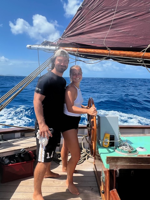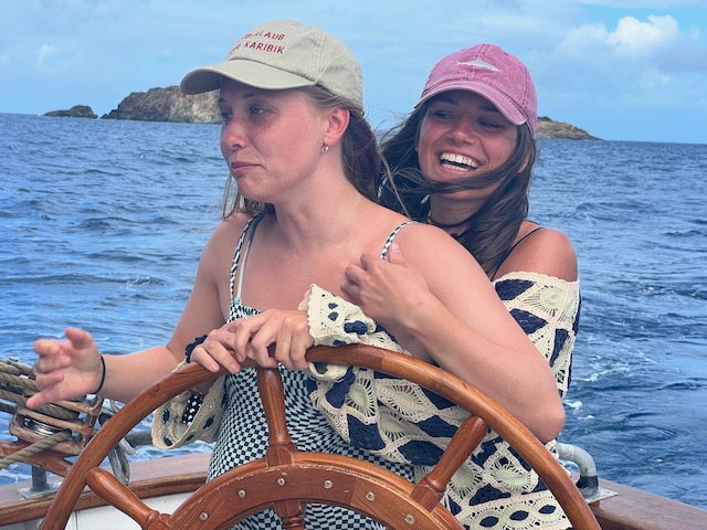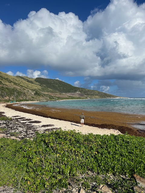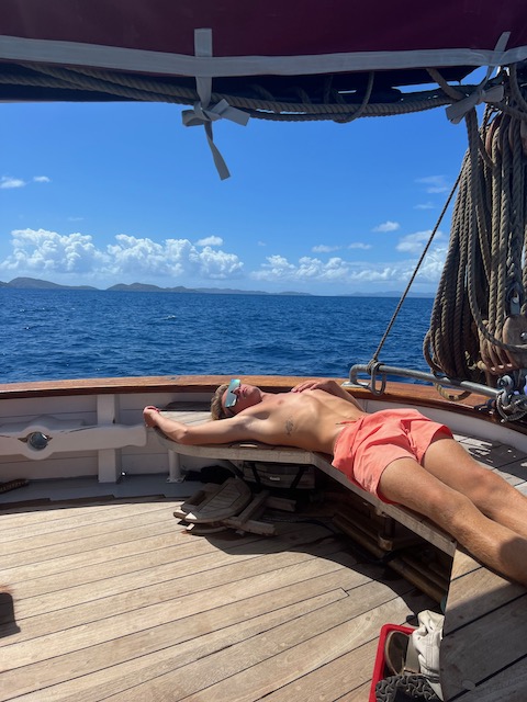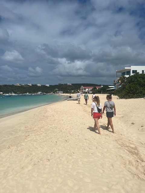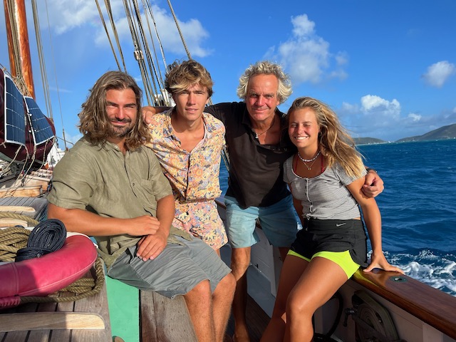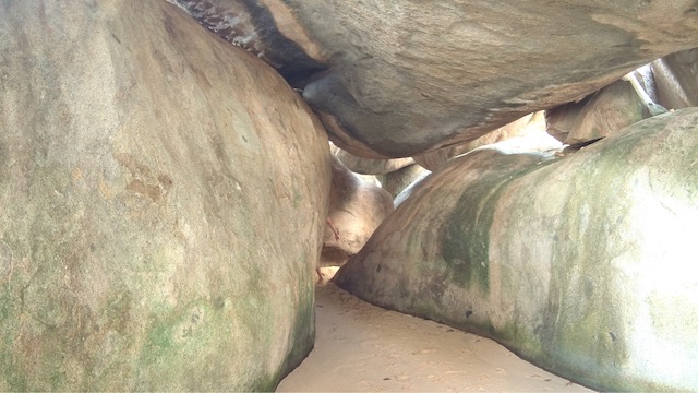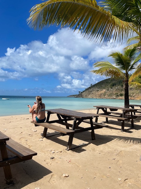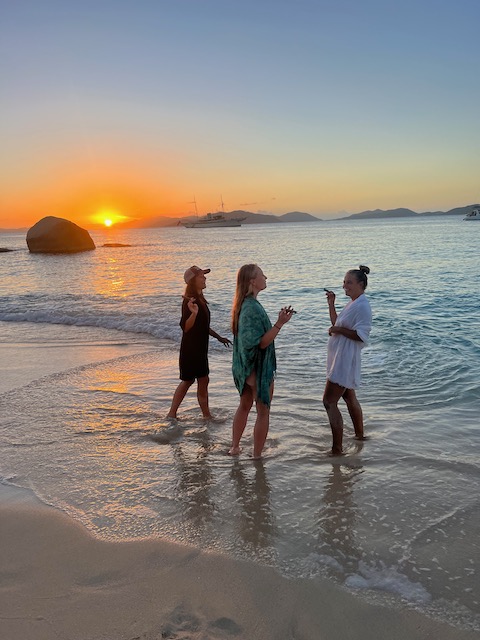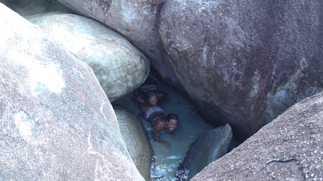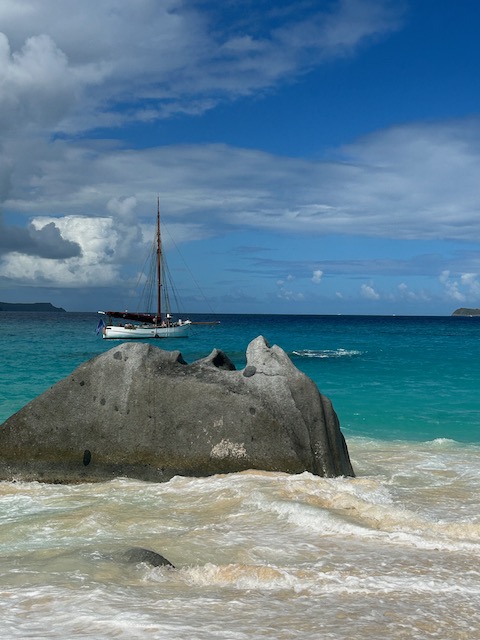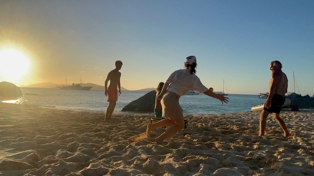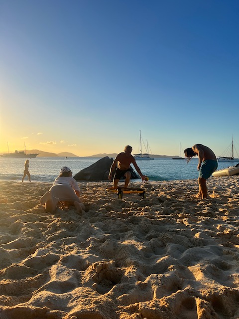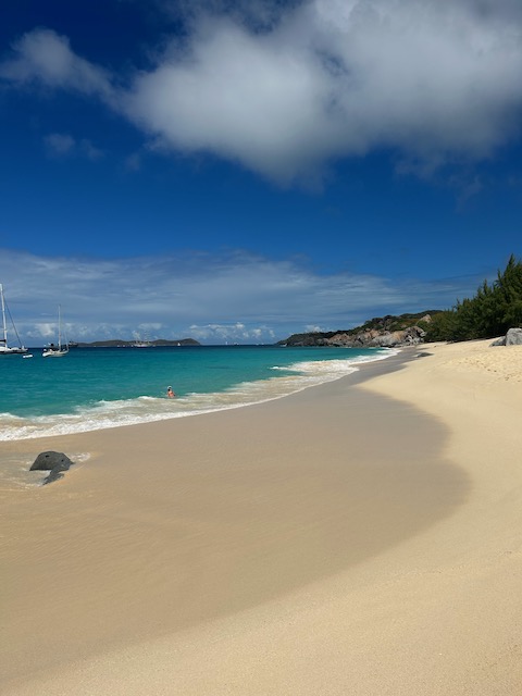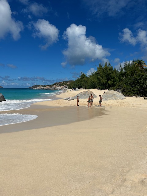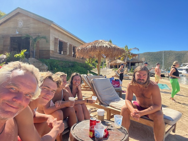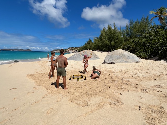 Obwohl der Fluglärm sich bei täglich 3 Verbindungen in Grenzen hält, verlassen wir diesen Platz, um bei ruhigem Wetter 5 Meilen weiter vor das Naturschutzgebiet an der Westecke von Virgin Gorda zu verholen. Kristall klares Wasser lässt uns stundenlang schnorcheln, bei „The Baths“ gehen wir an Land und erkunden unzählige Höhlen und Gänge, teilweisen vom Meer durchspült. Einige Durchgänge sind sehr eng, der Erste, der sich durchquetscht, hält die Luft an und wird von den anderen durchgeschoben, dann zieht er den Rest hinterher, schon etwas aufregend. Total aufgeweicht klettern wir wieder an Bord, slippen die Mooring (man darf in den Naturschutzparks nicht übernachten) und fahren in die Valley Trunk Bay, 500 Meter weiter. Hier fällt der Anker. Ein absoluter Traumstrand, riesig, weich und weiß, nahezu keine anderen Menschen. Hier verbringen wir Charly und Memes letzten Abend bei Spikeball, gepflegten Getränken und Zigarren im Sonnenuntergang. Der alte Hemingway hätte es genauso gemacht. Allerdings nicht knöcheltief im Wasser, im Bikini, sondern im Lehnstuhl mit Strohhut.