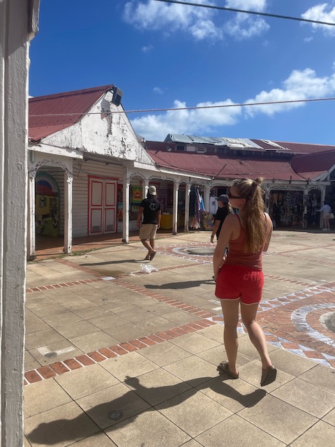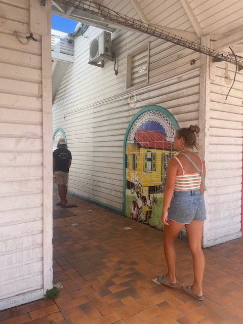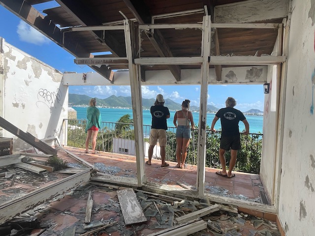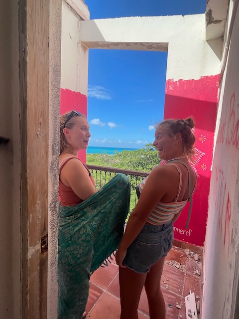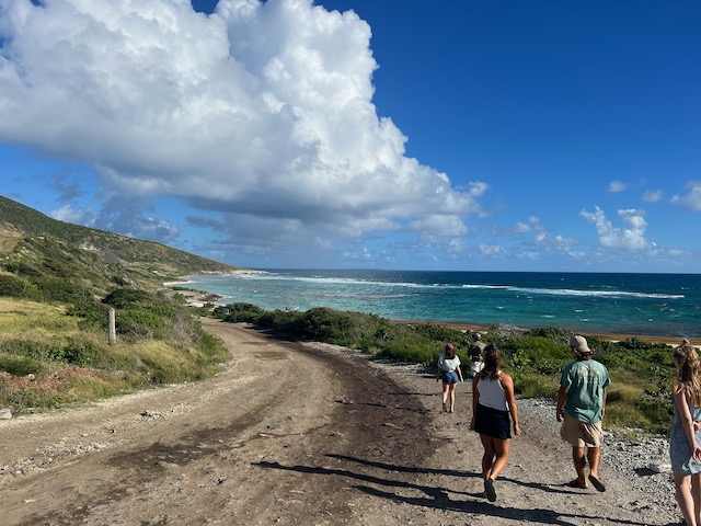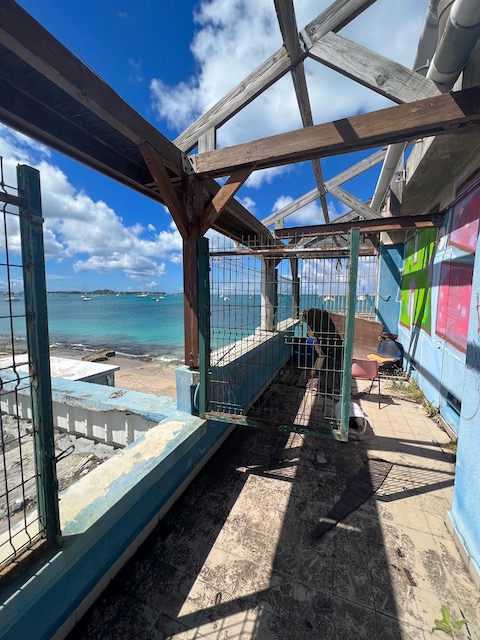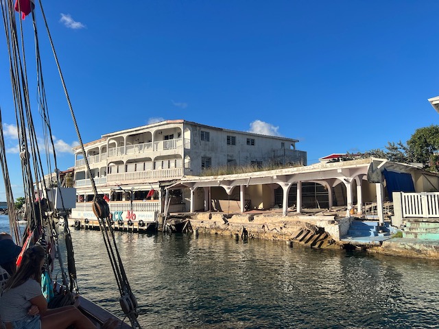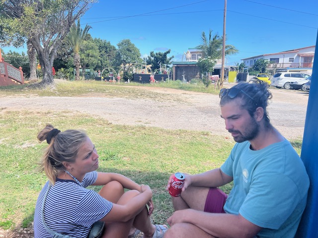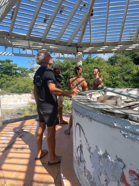 Kurzes Einchecken am Behördencomputer im Schiffsbedarfsladen, ausgedehnte Stadtspaziergänge, Burgbergbesteigungen, Marktbesuche…. später mieten wir ein großes großartiges Auto. Wir hinterlassen Chris und seine Freundin Steffi in ihrer Stammkneipe und fahren in ein ehemals edles, großes Resort. Zerstört vom bis zu 156 Knoten (ca. 300 Stundenkilometer) starken Wind dient es jetzt der örtlichen Partyszene als Treffpunkt. Sehr fotogen. Mit Tom, der endlich fertig ist, geht es gen Osten an einen schönen Strand und für den Sonnenuntergang auf den höchsten Berg der Insel. Auch fotogen.