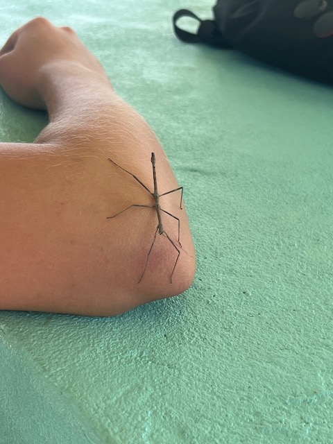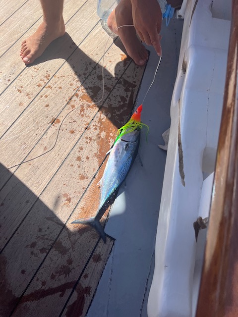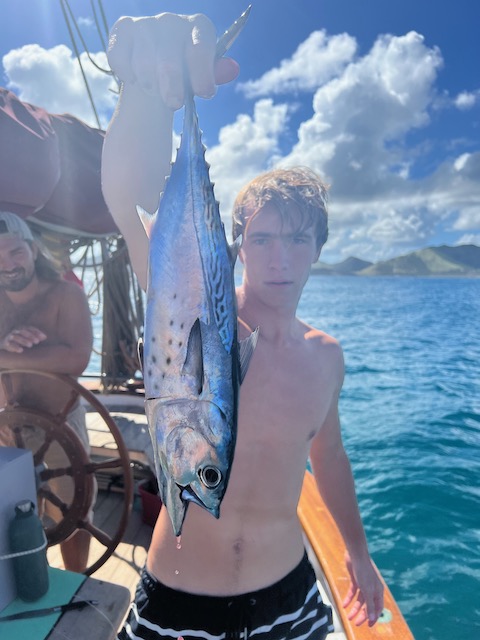 Erst zu einem wilden, für seine wilde Unterwasserwelt bekannten Felsen, dann, relativ kurze Zeit später (war leider etwas langweilig) zu der Insel Tintamarre. Die 5 Meilen lange Überfahrt nutzen wir zum Fischen, natürlich mit mäßigem Erfolg. Der Besuch einiger Pilotwale fesselt uns so sehr, dass wir erst beim Einholen der Angel merken, dass da ein Bonito, ein kleiner Thunfisch angebissen hat. Die arme Kreatur wurde von uns offensichtlich so lange hinterher gezerrt, dass sie beim Einholen kaum noch zappelt. Das Grillsortiment des Abends war nun komplett.