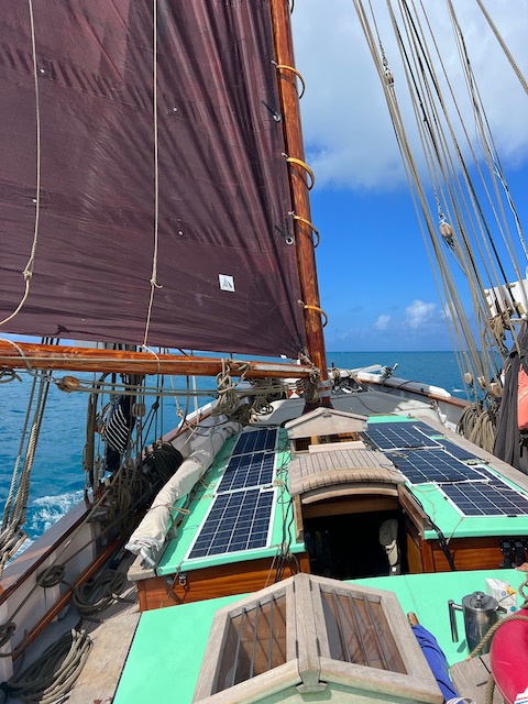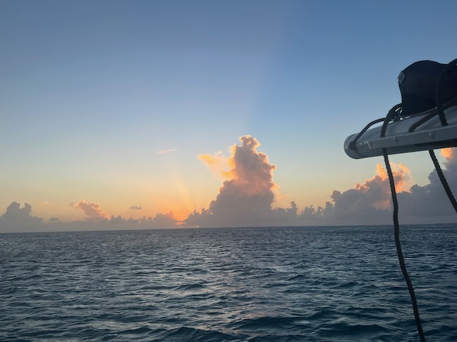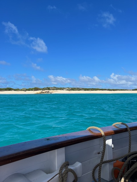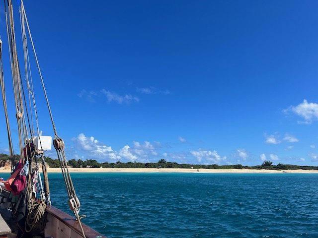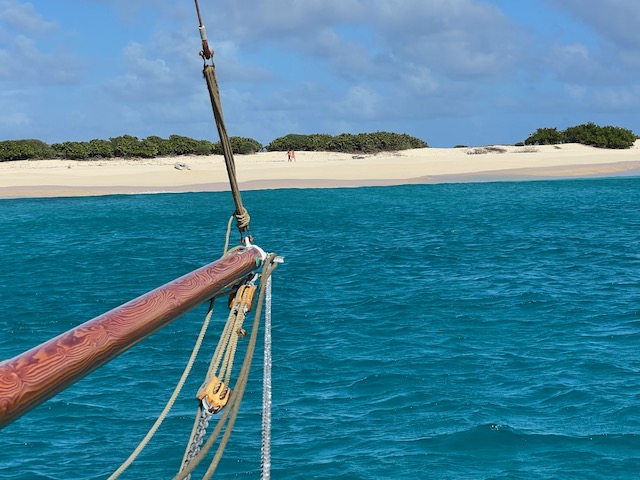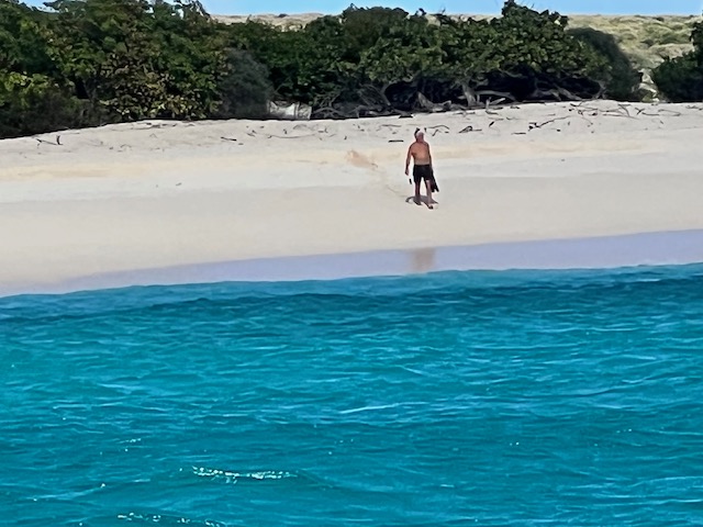 Auschecken am nächsten Morgen gewohnt unkompliziert und freundlich. Der Wind hat ein gutes Stück Richtung Ost gedreht und so ziehen uns die Segel in das endlose Blau hinaus. Am Rand unseres Kurses liegt nach 10 Meilen Dog Island, ein unbewohnter Robinson Crusoe Sandhaufen. Als einziges Schiff pausieren wir in der Ankerbucht, keine Fußspur im weißen Sand. Landgänge machen wir versetzt, Aurora tanzt in nicht unerhebliche Wellen, zerrt an ihrer Kette. Ankerwache.