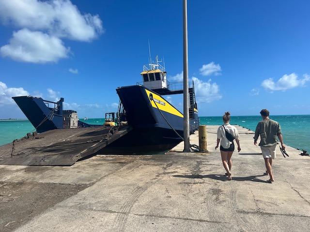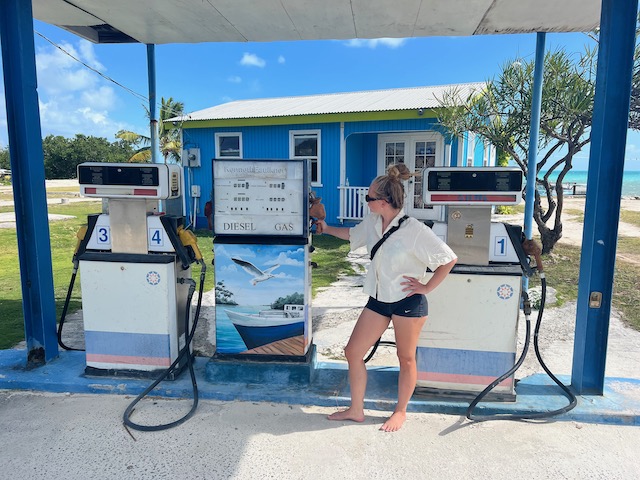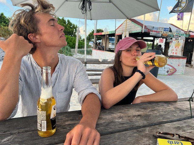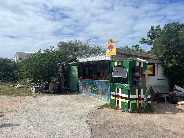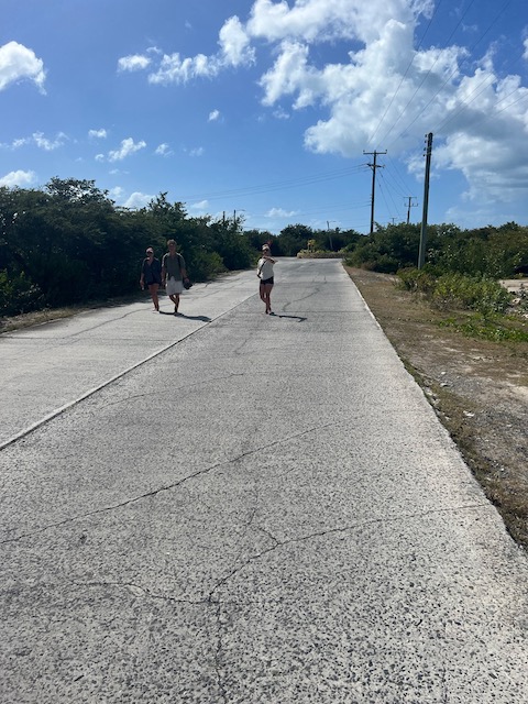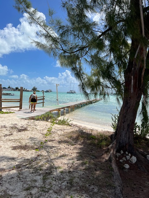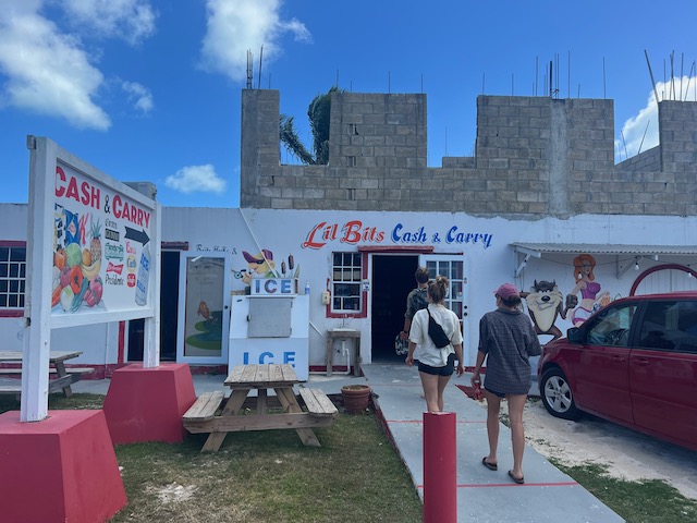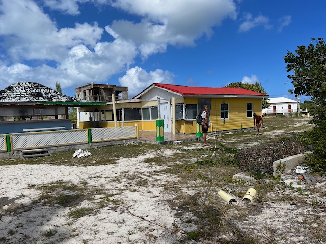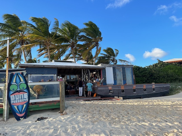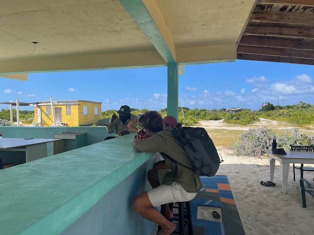 Hier ist es sowieso schön, vieles will noch erwandert werden. Die, natürlich, größte Flamingo Population der Karibik, eine höllisch heiße, staubige, schattenlose Wanderung entfernt, wartet natürlich auf uns. 50 Liter Schweiß später denken wir uns: Sollen die Flatterviecher doch rosa werden vor Warten. Wir drehen um und folgen einem Wegweiser zu einer urigen Strandbar, die Dehydrierung zu bekämpfen. Der einzige Mensch weit und breit ist Mitch, der Besitzer. Ja, es gibt etwas zu trinken. Bier, Bier oder Bier und nach längerem Suchen eine Flasche Wasser. Morgen würde er auch für Wein gesorgt haben. Der Platz ist allerdings überwältigend schön und einsam. Mitch hat Zeit, erzählt gerne und viel. Er ist auf der Insel für die Überland Kabel verantwortlich, davon hat Hurrikan Irma 2017 80% zerstört, er und sein einziger Helfer sind immer noch nicht ganz fertig. Sehr stressig, wenn man auch noch eine Bar hat. Allerdings nehmen sich die wenigen Gäste in seiner Abwesenheit das Bier selbst und legen das Geld auf den Tresen. Deswegen könne er uns auch zu den Flamingos fahren, bei denen wir fast waren, und auch sonst ein wenig die Insel zeigen. Ab geht’s, alle in sein Auto gequetscht. Der Turm zum Betrachten der edlen Kreaturen ist gleichzeitig der höchste Punkt der Insel und hat zum Glück ein Fernglas für die rosa Flecken auf der anderen Seite. Nach einem Abstecher in die Hauptstadt, Settlement, sehr trostlos, fährt er uns zurück zum Dinghi. Was für ein Ehrenmann.