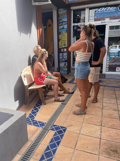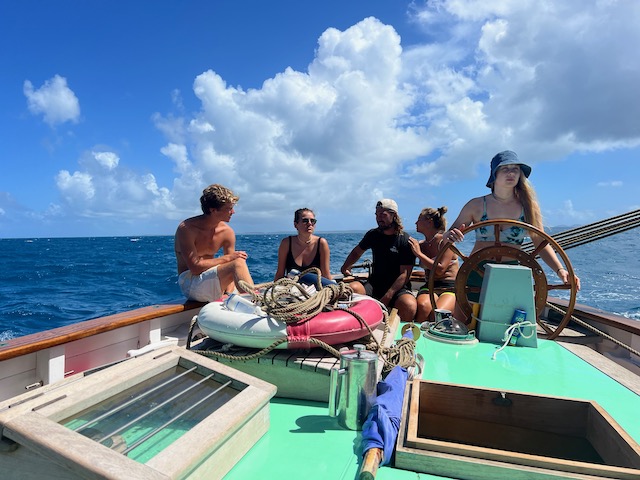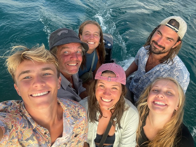 So einer fehlt am nächsten Morgen. Wir wandern nochmal über die Insel. Diesmal in die andere Richtung, mit Schnorchel Ausrüstung, genauso brutal heiß und noch viel weiter. Am Ende wieder eine Bar, leider geschlossen, kein Self Service. Stattdessen kühlt das Meer die qualmenden Füße und Köpfe. Zum Schnorcheln ist es Mist, zu flach, zu schlechte Sicht, das spannende Außenriff unerreichbar weit draußen. Hier sollte man Kiten. Als wir uns mit annähernd letzter Kraft zum Restaurant am Dinghi-Dock zurück geschleppt haben, kommt eben so eine Gruppe fröhlicher, gutaussehender Kiterinnen und Kiter, sie hatten ein Auto, um mit ihrem Schlauchboot die 17 Meilen nach Moskito Island (neben Prickley Pear Island) zurückzufahren. 300 PS. Sie bitten Tom ein Foto von ihnen zu machen, ein Kontakt wurde getauscht…