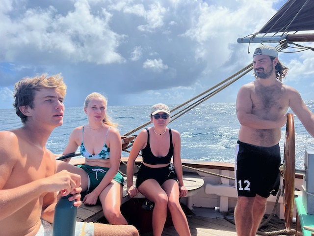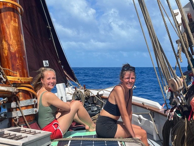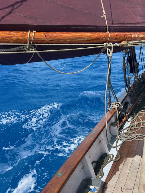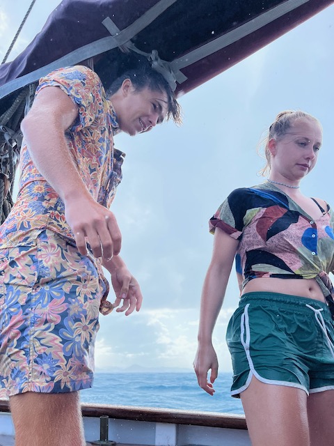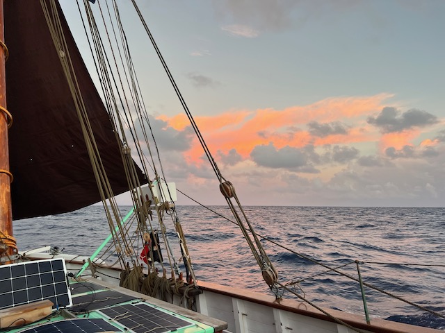 Wenig feierlich prasselt morgens Regen aufs Deck, Wolken türmen sich, schwere Schauer jagen einander. Wir setzen die Passatsegel und haben eine spaßige Vorwindsegelei, nach jedem Regenguss kommt die Sonne, wärmt, trocknet.
