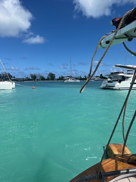 Mittags, man soll bei höchstem Sonnenstand die Flachs durchschiffen, um die Untiefen und Korallenköpfe sehen zu können, slippen wir die Mooring. Nach herrlicher Seefahrt rauschen wir wieder in die Bucht bei Prickley Pear/Moskito Island.