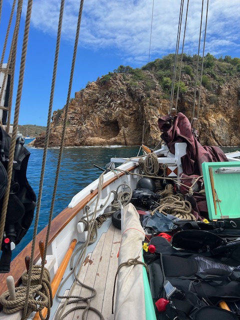 Ohne Schatz und ohne Rum, aber nach einer ruhigen Nacht, trödeln wir 4 Meilen weiter ins nächste Naturschutzgebiet. Bei ein paar garstigen Felsnadeln, den Indians, finden wir eine freie Mooring und die Muße unser Tauchequipment klar zu machen. Das Tauchprofil ist hier flach und einfach, so bekommt Lena Toms Ausrüstung und genießt ihren ersten Tauchgang. Tom begleitet uns als Apnoetaucher. Fantastisch.