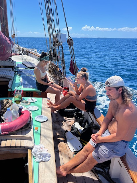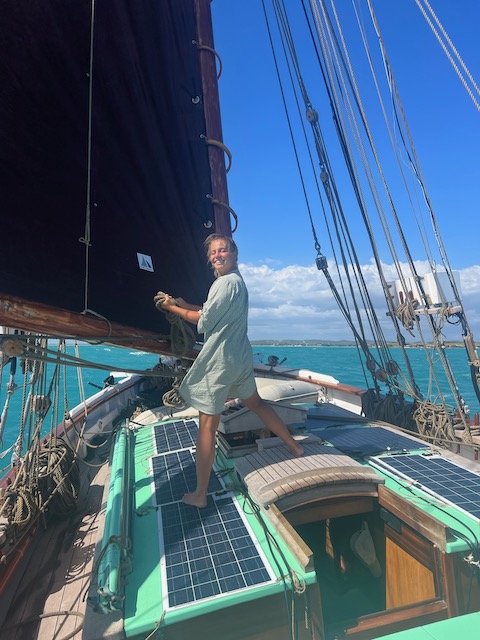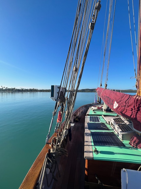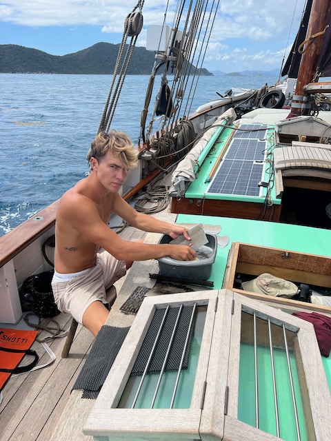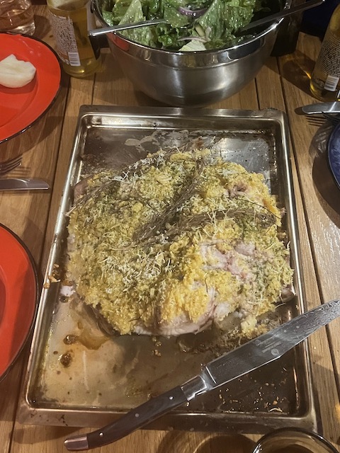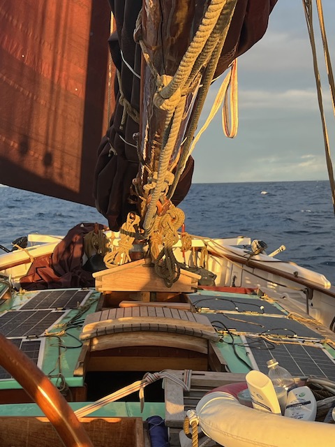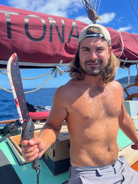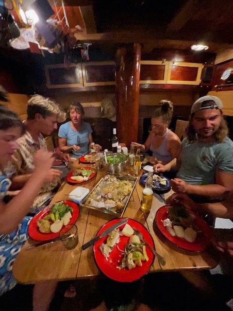 Die Stille, vor allem die Windstille soll leider einige Tage anhalten und so müssen wir die zunehmend längeren Strecken teils motoren, laut und teuer, Freud und Leid. Zu unserer Freude stören sich die Fische offenbar nicht an dem Lärm und auf halben Weg zum Festland Puerto Rico schnappt sich eine kapitale Pferdemakrele unseren künstlichen Tintenfisch. Filetiert ist es immer noch ein großer Haufen Fisch und so laden wir die Crew des Nachbarschiffes, Lena und Adrian, ein. Zubereitet als Braten in Kräuterkruste schmeckt sogar dieser Meeresbewohner köstlich.