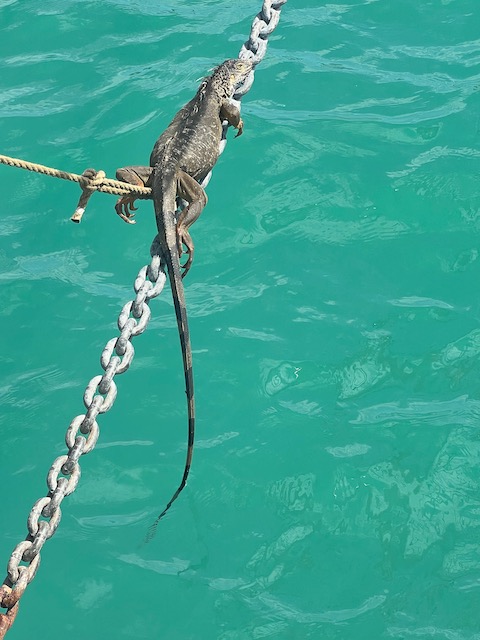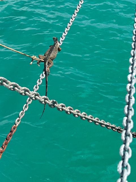 Und die Ausfahrt aus den Riffen am nächsten Morgen. Noch ist Wind, wir schießen um die Ecke von Cabo Rojo und ankern in einer Wunderschönen Bucht. Das speziellste war ein Leguan, der zu uns schwimmt, das Wasserstack erklimmt, um Gallionsfigur zu spielen, betrachtet von diversen Optimist Jollen die uns als Wendetonne ihrer Regatta benutzen.