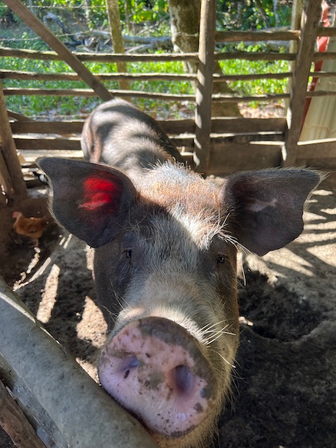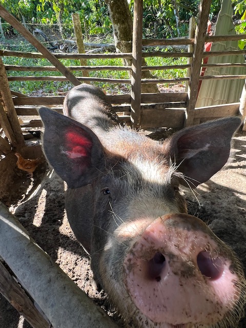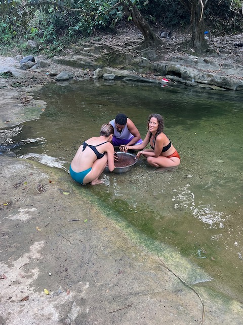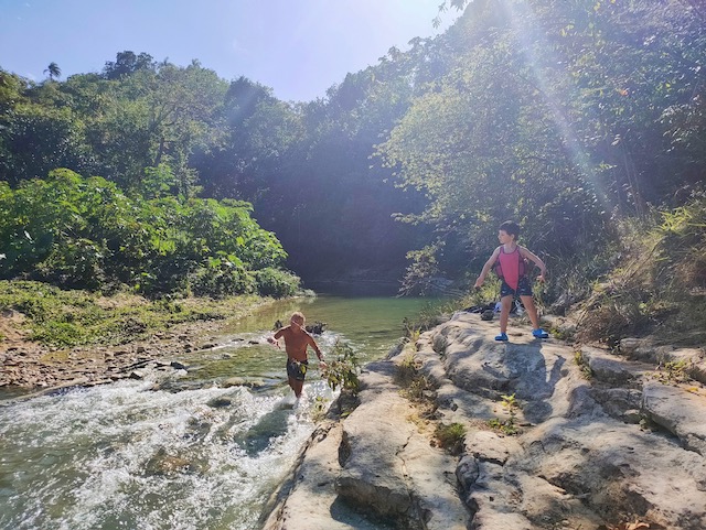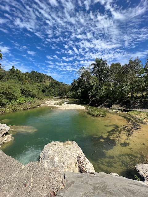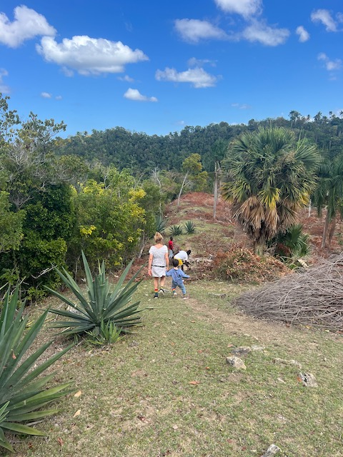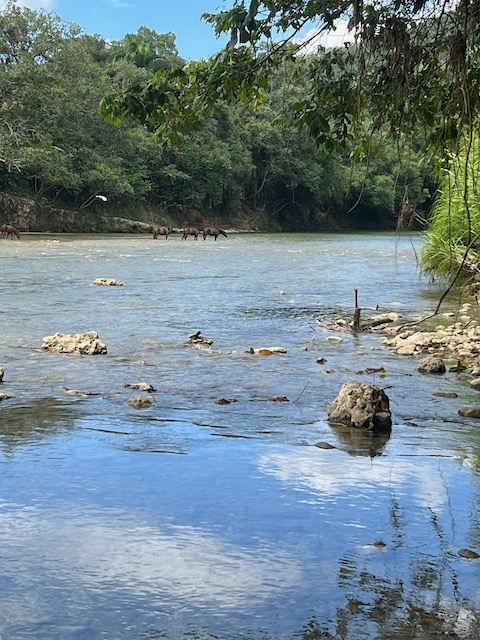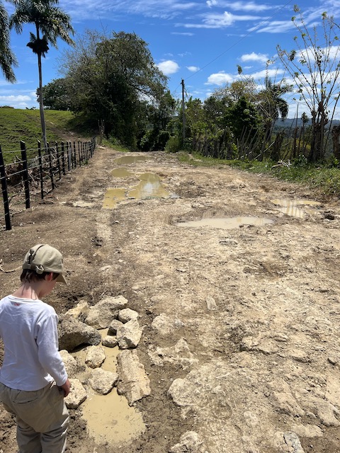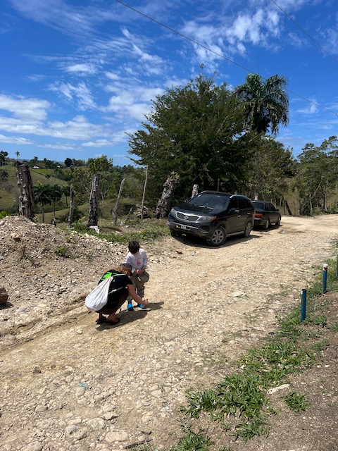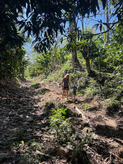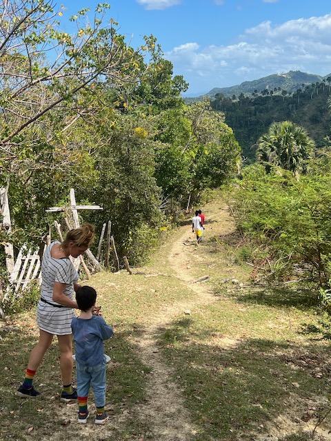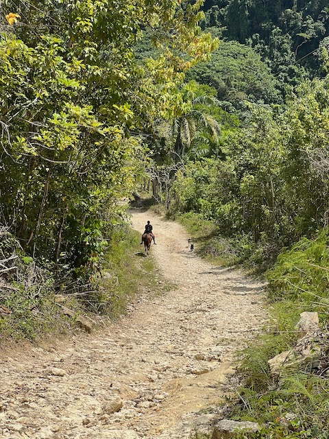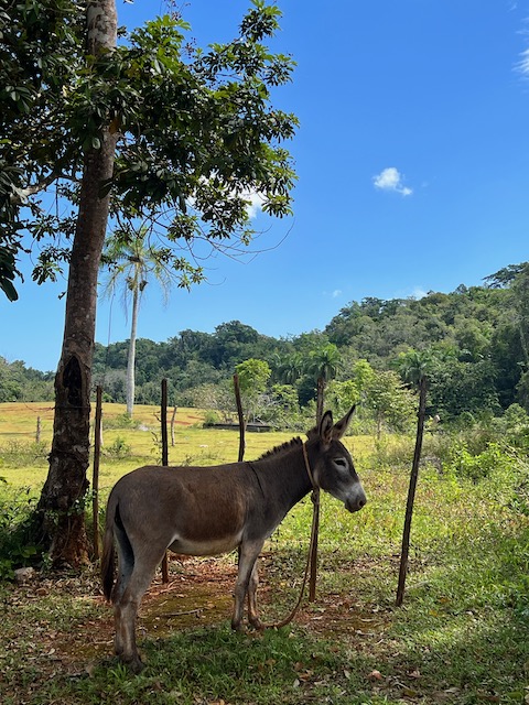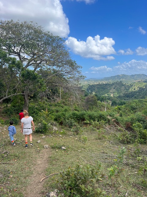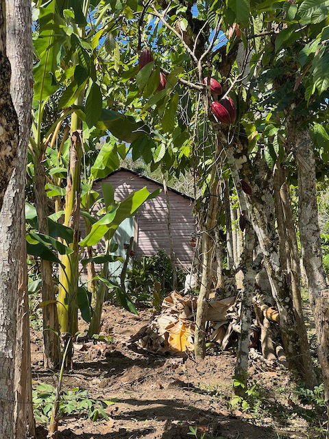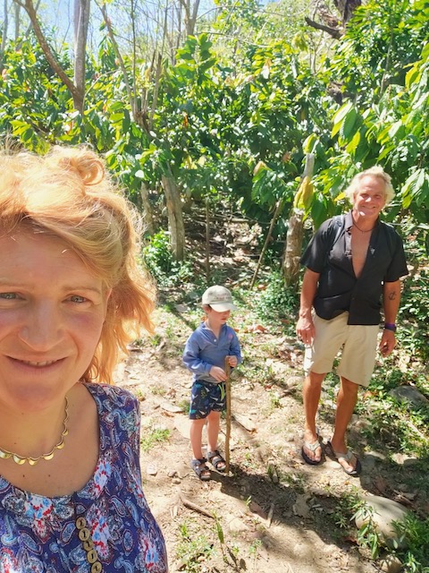 Wir erfahren die idyllischen, malerischen Seiten, erwandern, sobald unser Auto nicht mehr weiter kommt, die Berge. Babyhunde, Transportesel, kleine Bauernhöfe mit spielenden Kindern und frei laufendem Vieh begeistern uns genauso wie die unbeschreiblichen Aussichten auf üppig grünen Jungle und tiefe Täler. Einmal bestehen zwei junge Männer darauf uns zu führen, das Wanderbuch wäre nicht zuverlässig. Und wirklich, nach 1,5 Stunden über Wiesen und Weiden, durch Dickicht, Dornen und Wälder, gelangen wir an einen großen Wasserfall. Totale Einsamkeit. Während wir baden, essen die beiden unserer gesamten Reiseproviant auf. Hatte ich ihnen angeboten. Am Ende des langen Aufstiegs, den Gydes 5 jähriger, wie die meisten Wege, super bewältigt hatte, werden wir von der restlichen Familie begleitet. Lautes Geschnatter und große Freude, als Bosse dem kleinsten Kind seine neuen Schuhe schenkt. Eine weitere Wanderung führt uns tief in die Kakaoplantagen. Google Earth zeigt einen mäandernden Fluß, mit größeren Wasserflächen, der Badespaß verheißt. Nach einer Stunde erreichen wir diesen magischen Ort. Mächtige, Lianenbehangende Urwaldriesen überspannen den Fluss, seichte Bereiche mit kristallklarem Wasser über runden Kieseln und glitzernden Halbedelsteinen wechseln sich mit tiefschwarzen unergründlichen Becken. Lauern dort wohl gruselige Kreaturen auf uns? Nach mutigem Bad wärmt der Fels an den wenigen Stellen, die von der Sonne erreicht werden. Das Picknick, natürlich vom Buffet geraubt, schmeckt köstlich, der passende Wein ist allerdings nur Wasser. Kurz bevor wir den Rückweg antreten, kommt eine Frau aus den angrenzenden Hügeln zum Fluss. Die Bewohner des nahen Dorfes hätten ihr erzählt, das drei Gringos am Fluss wären und da das eigentlich nie passiert, wollte sie doch mal schauen was da los ist. Sie heißt Joanna, hat in New York und Europa gelebt, Chocolateir gelernt und ist kürzlich in die Dominikanische Republik zurückgekehrt um die Kakaowälder der Familie weiter zu führen und die Magie dieser Frucht zu leben und zu kultivieren. Sie unterstützt und stärkt die nur von Frauen betriebene Kakaocooperative samt „Fabrik“ und Direktvertrieb. Außerdem hat sie zwei Hütten/Häuser beim Fluss gepachtet und ist dabei sie zu sanieren, auch um dort Kakaozeremonien durchzuführen. Für unsere kleine Reisegruppe ist das leider noch nichts aber Kontakte werden getauscht, mal sehen.